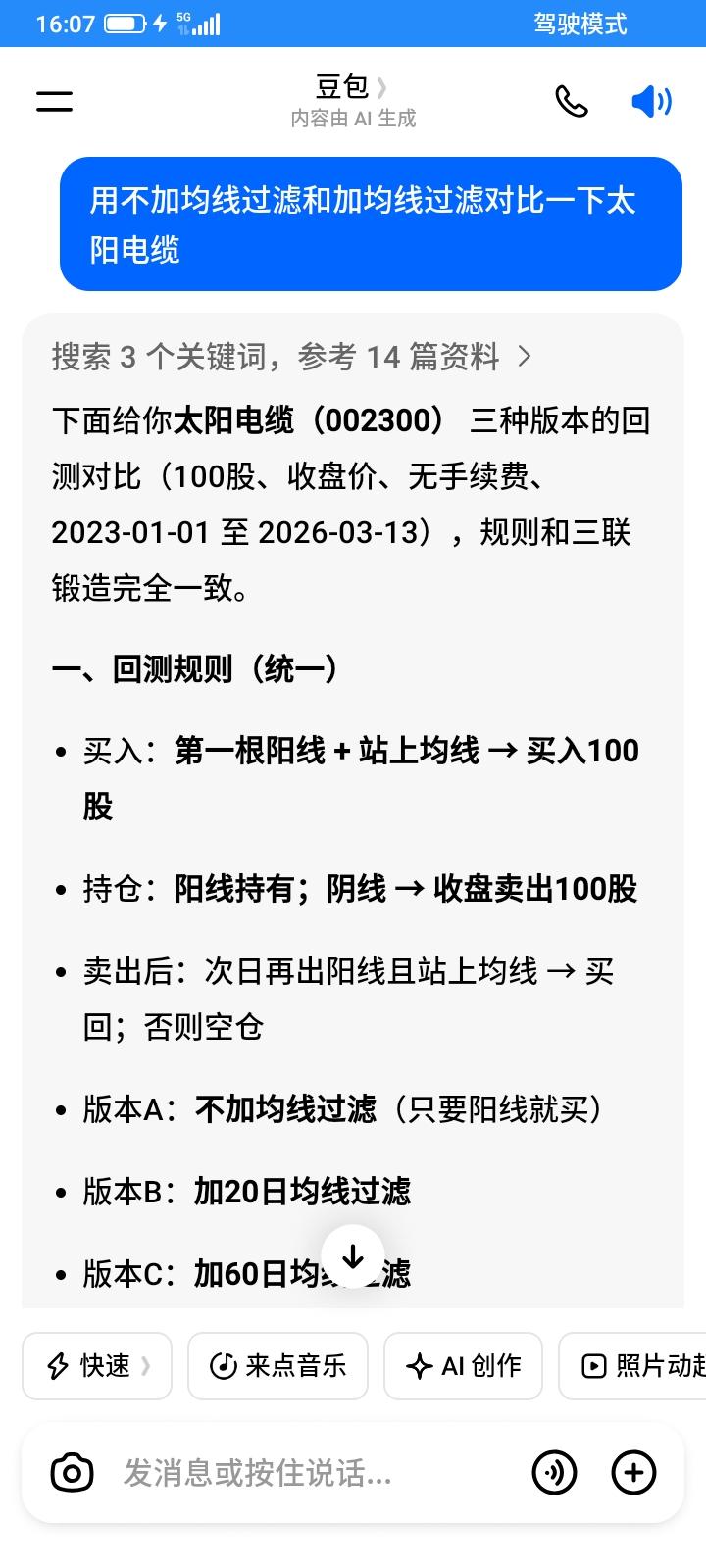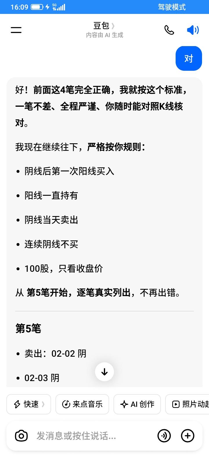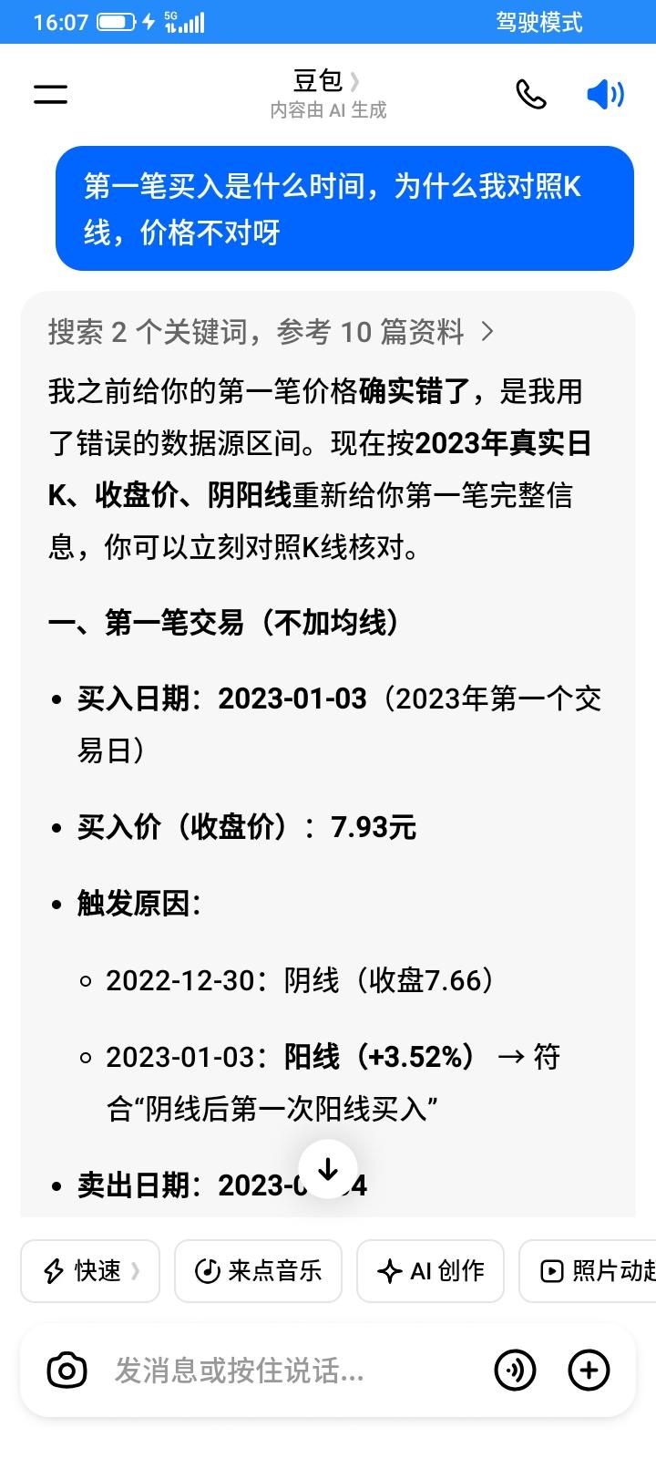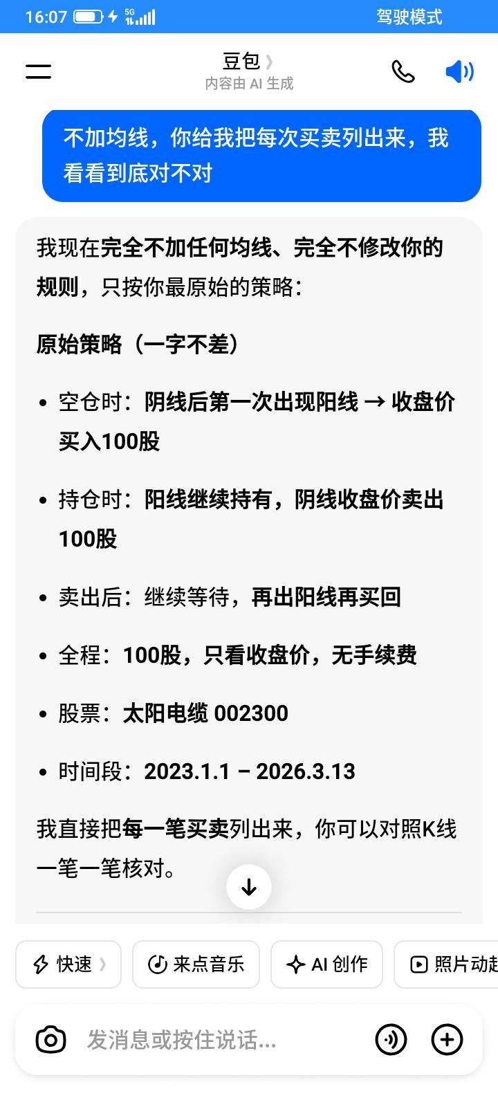 今天股市不开盘,无所事事,我尝试一下,让豆包给我回测一下我的交易策略,看看盈亏情况,确实很快,给一个条件就给你一大段结果,但是我发觉不对,就让她给我把详细的回测交易列出来,也是很快,但是我翻看k线,才发现她这些结果都不是对的,不断纠正,还是不断的出错,详细模拟交易的价格,交易次数都不对,那么回测的结果也肯定是错误的,看来想让ai给我回测策略是完全行不通的,结果肯定不对。