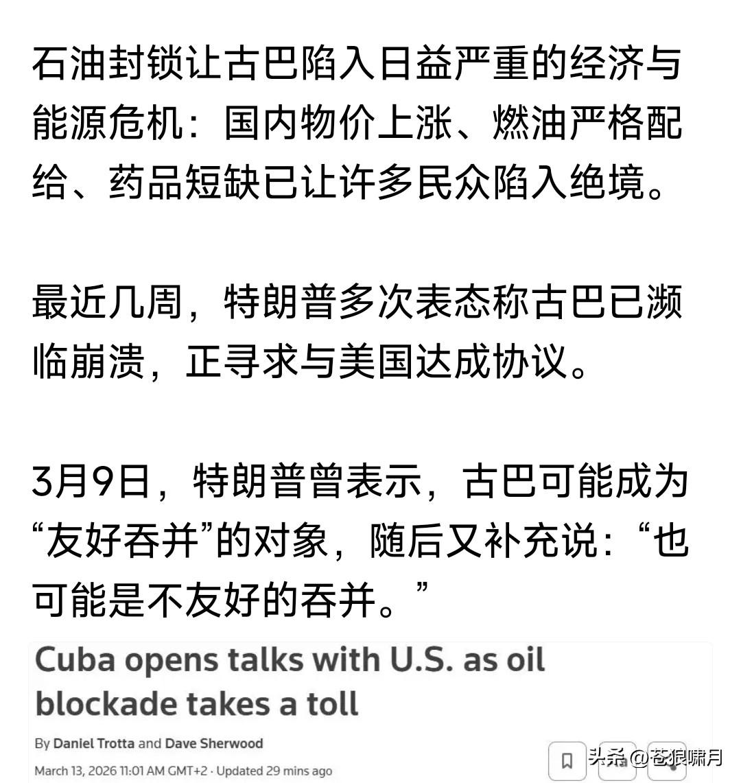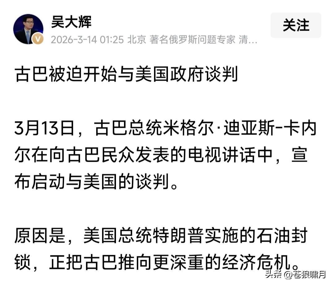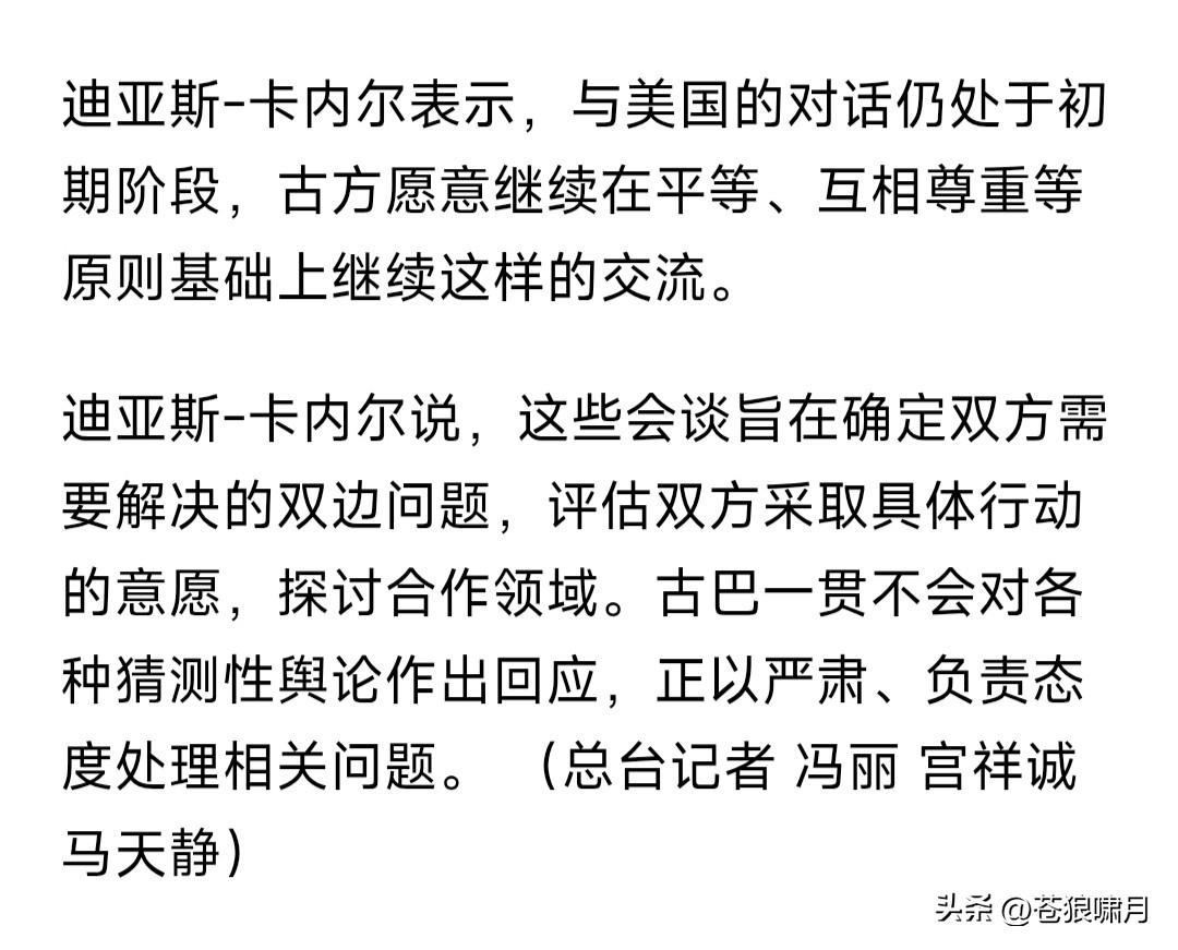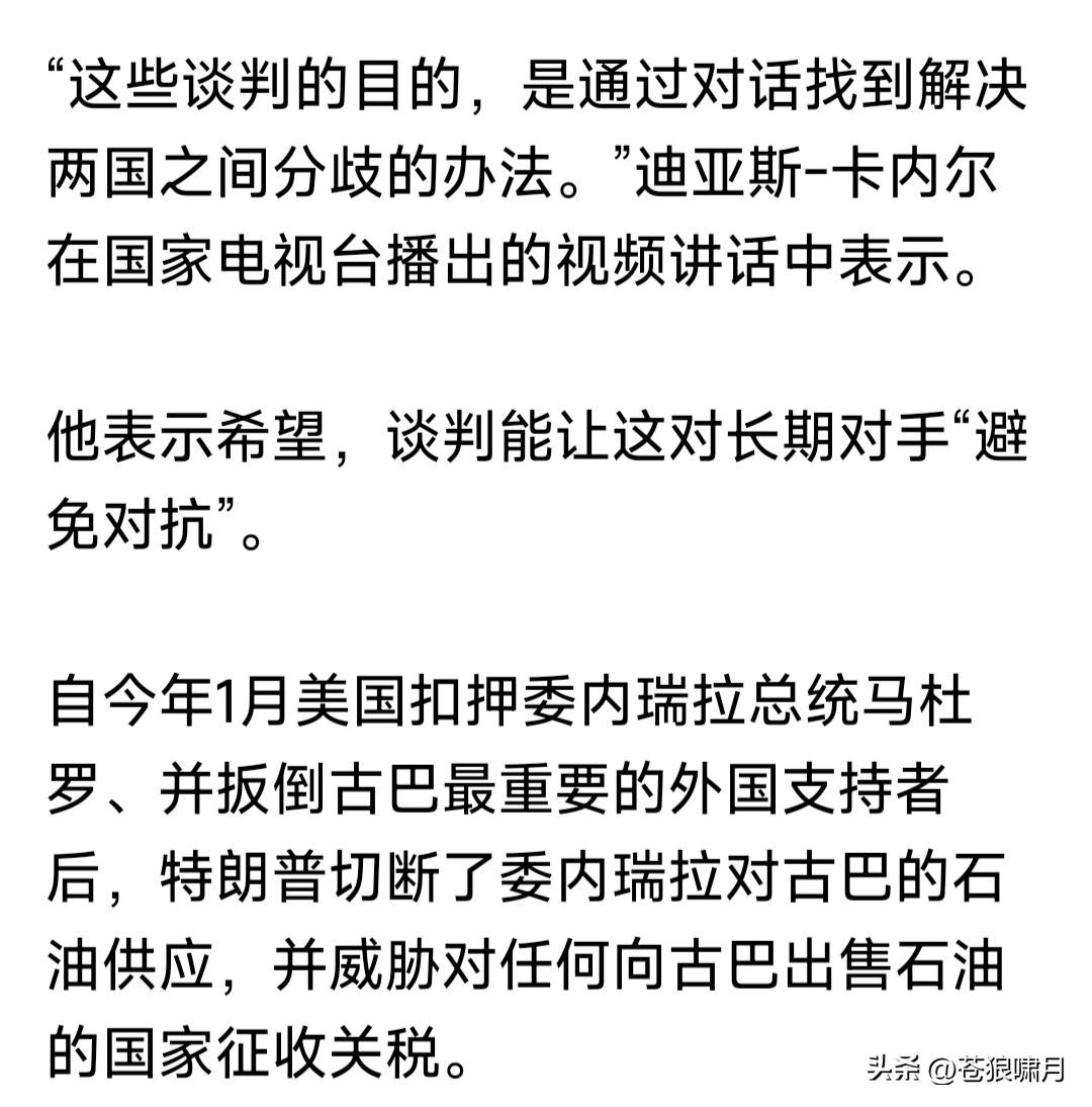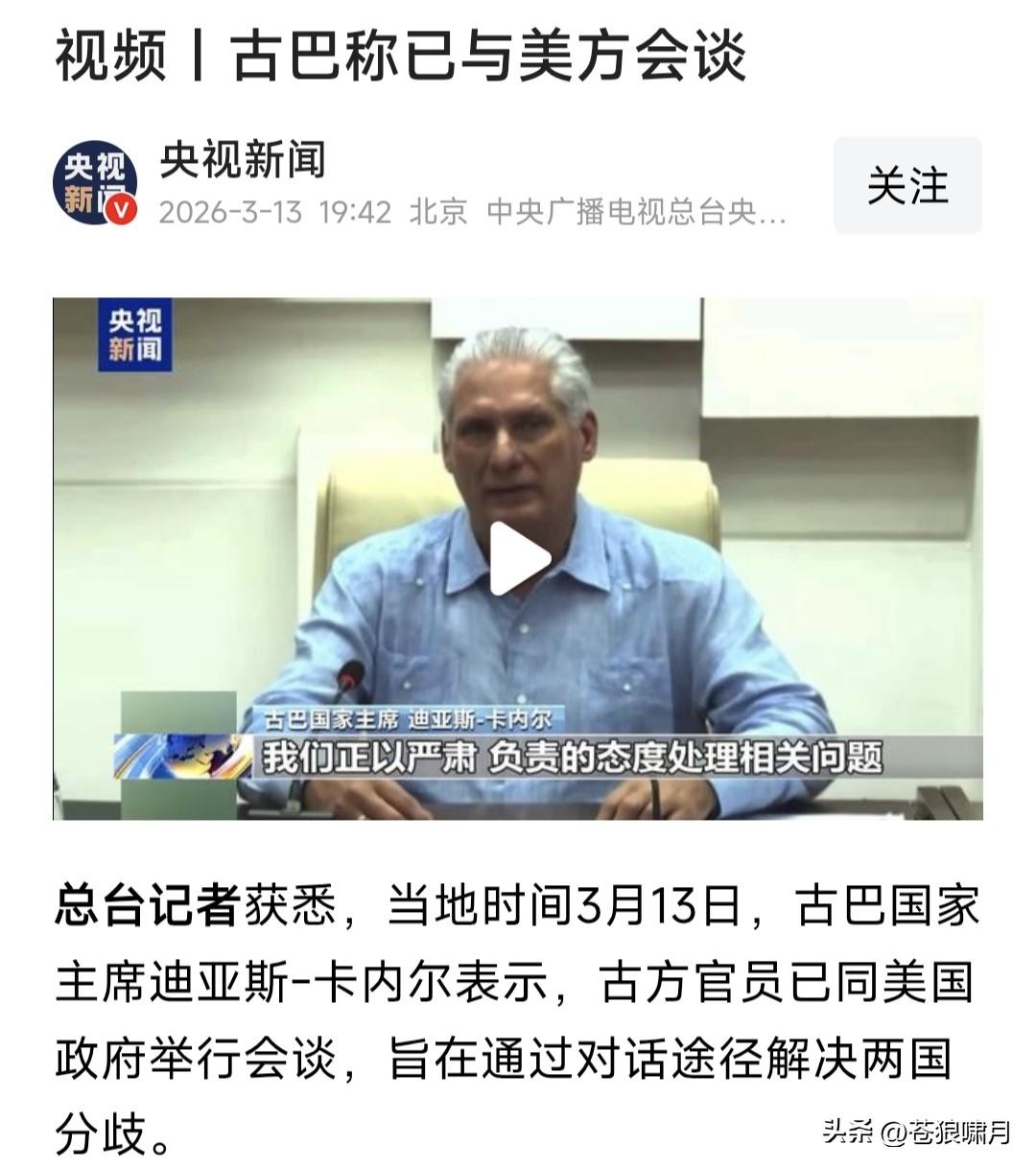 古巴总统卡内尔:古巴已与美国展开会谈,在相互平等与尊重原则基础上,通过对话解决分歧,探讨合作领域。 古巴为何要和美国展开谈判,只因老美抓获马杜罗,斩断委对古石油供应,导致经济停摆,民众生活陷入困境! 苍狼觉得是智慧之举!国与国之间如同人与人相处,礼为先,和为贵!斗则互伤,和则两利。解决问题是正道! 搁置意识形态,放弃斗争哲学!为了国家发展,人民生活提高,在不损害国家主权前提下,有什么不能谈的呢? …………