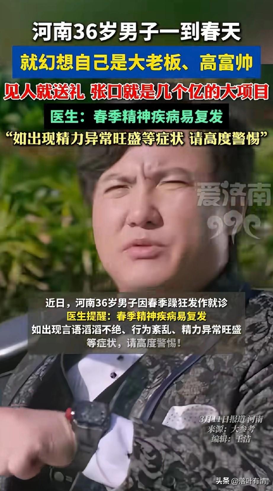 河南一男子, 一到春天就幻想自己是大老板, 见人就送礼, 张口就说自己有几个亿的大项目, 医生提醒,春天精神类疾病易发作, 该男子思想紊乱, 但是话语滔滔不绝, 而且精力异常旺, 周围的人都看到他很开心, 毕竟没见过这种精神类疾病, 大家见过这种精神病吗?