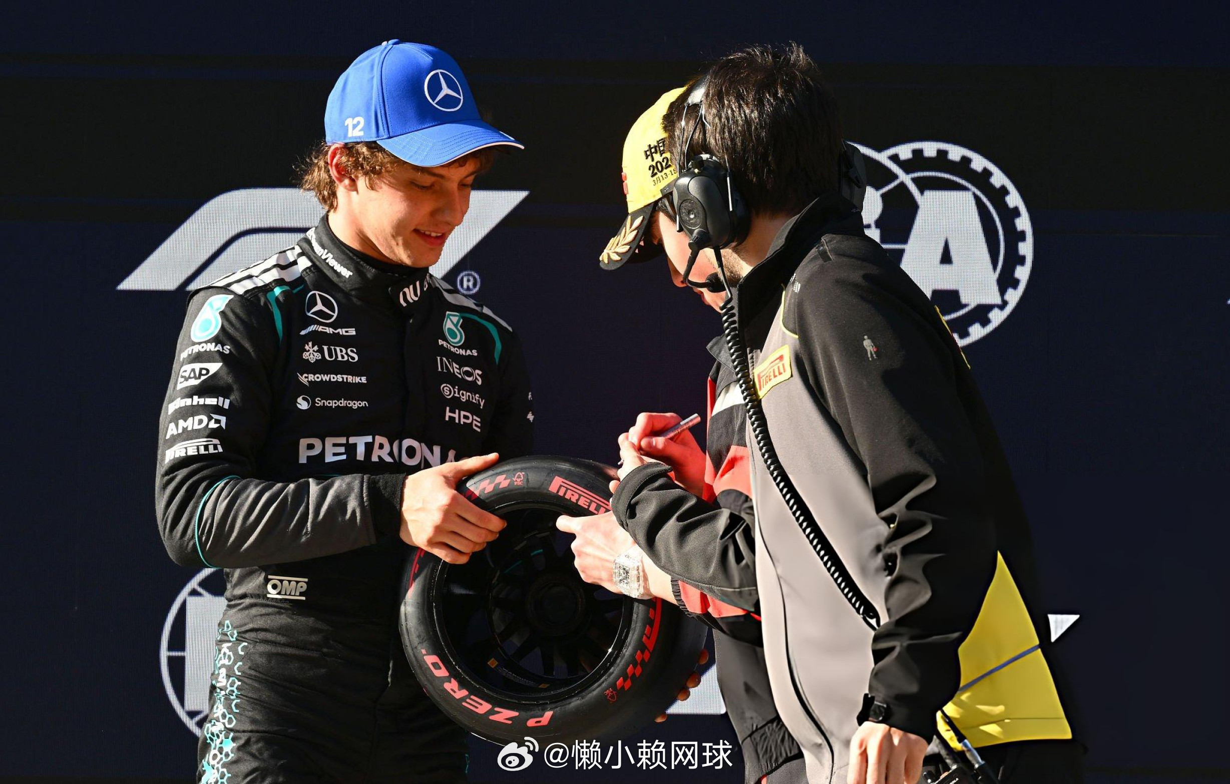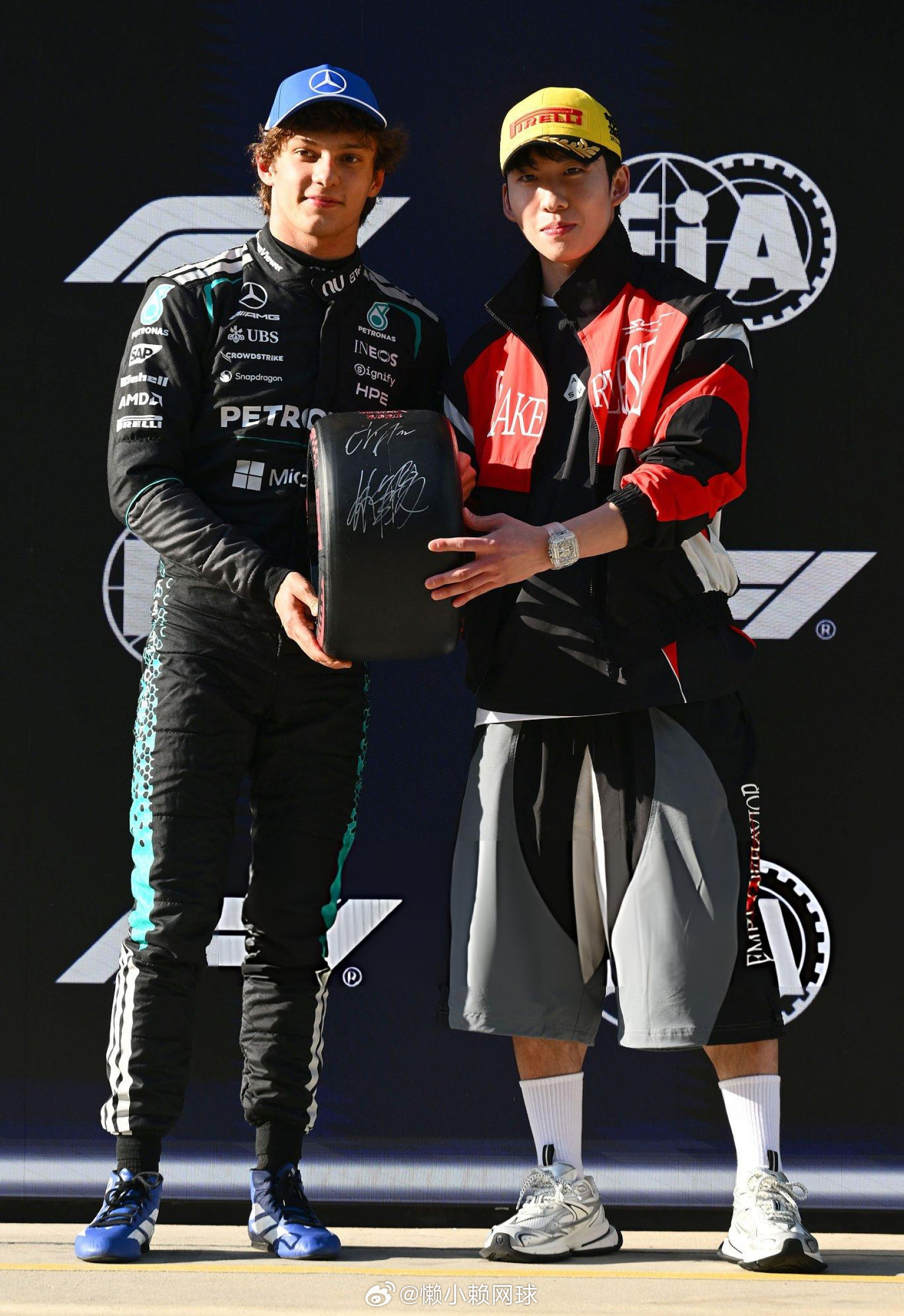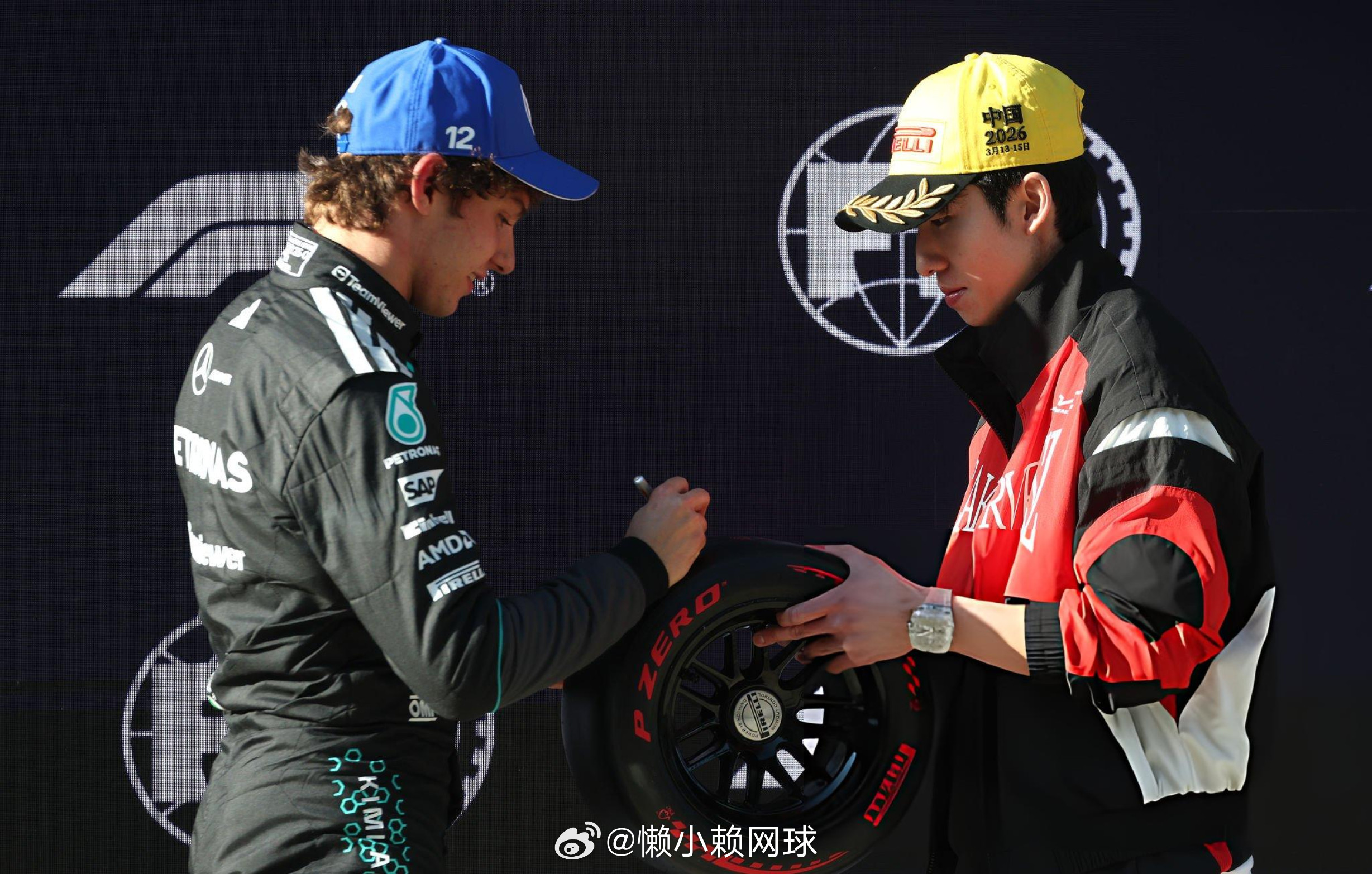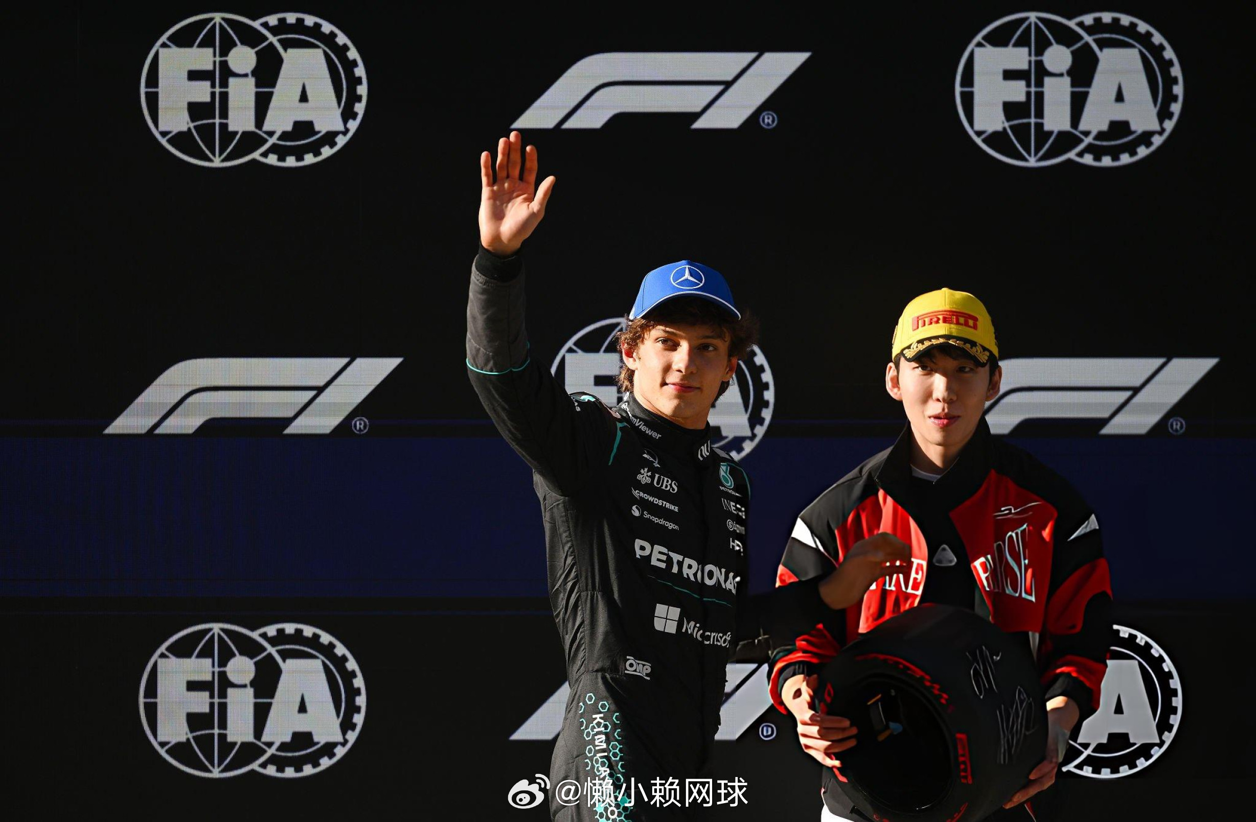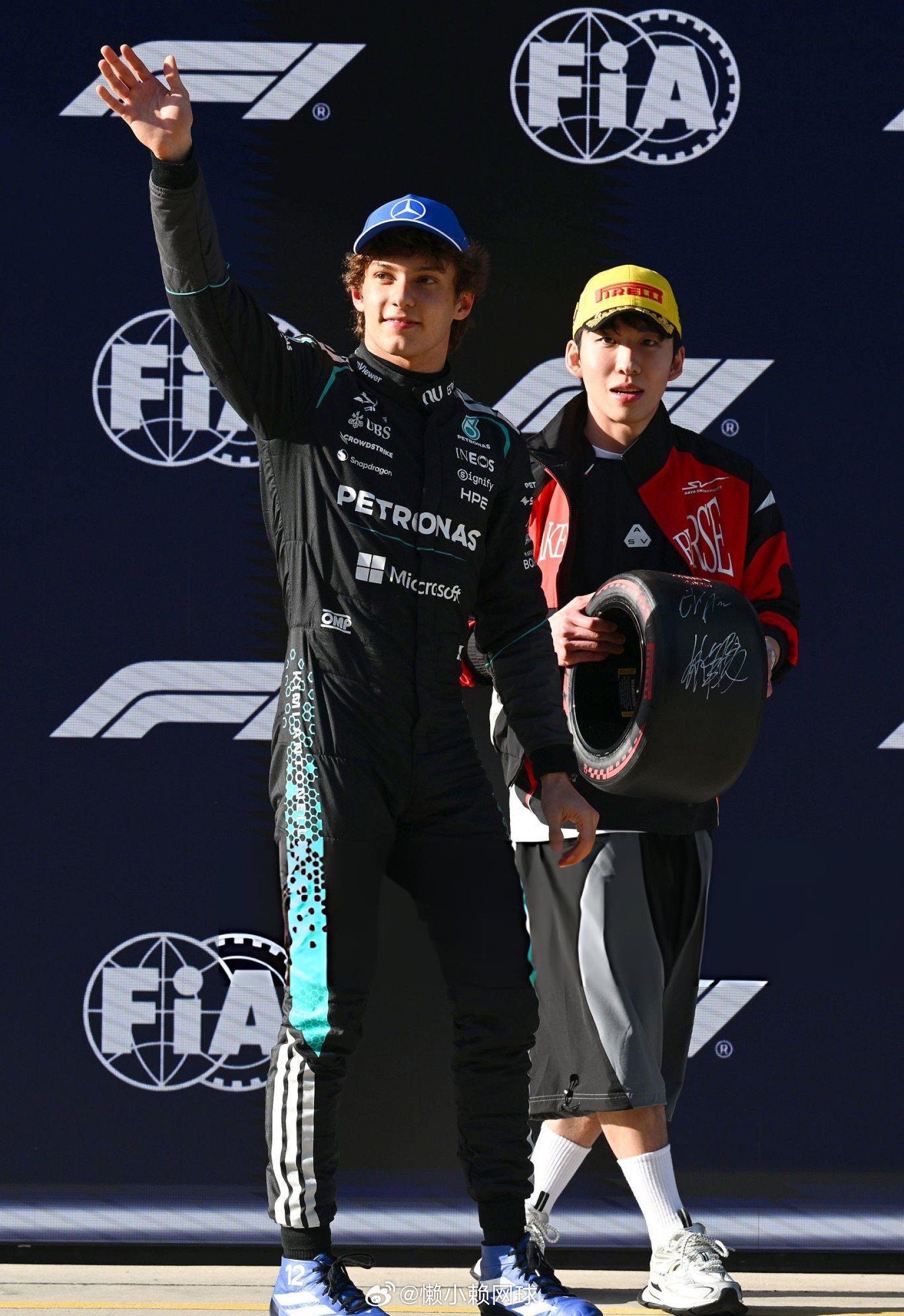 林孝埈为F1历史上最年轻的杆位得主安东内利颁奖!林孝埈为安东内利颁小轮胎安东内利夺f1生涯首个杆位