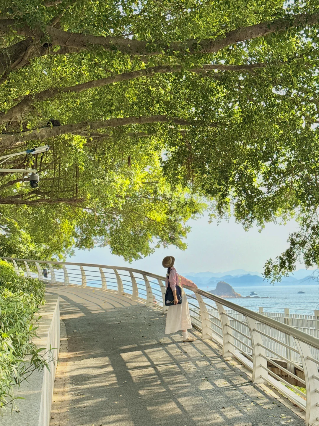 非常适合骑行的一条路线,沿海1.6km左右,骑车沿路有三角梅和大榕树,很春天的海边栈道💗