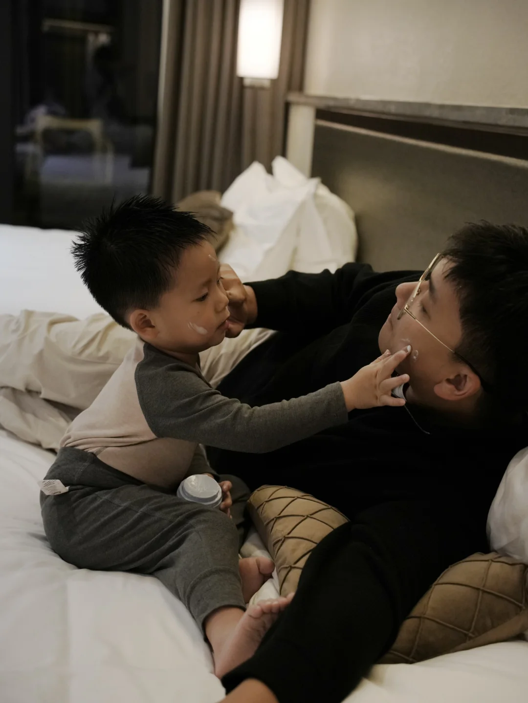 看到宝宝和爸爸互相涂面霜的画面
