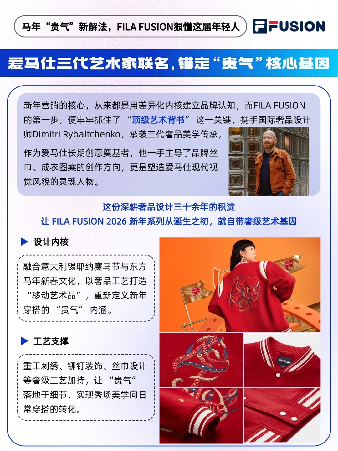 🔵2026农历马年,FILA FUSION携手爱马仕灵魂人物、三代奢品世家艺术家Dimitri Rybaltchenko,将意大利锡耶纳赛马节的狂欢基因与东方马年的奋进意象交织,用奢侈品级的工艺语言,重新定义了什么叫做“贵气”新年。