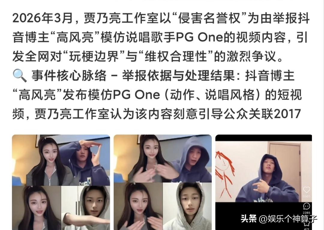 某博主模仿pg1,被贾乃亮举报了![捂脸] 3月14日,贾乃亮登上热搜,这一次,不是分享与女儿甜馨的生活日常,而是把某博主给举报了,瞬间引发热议。 网上晒出一段视频,某博主为了满足粉丝的要求,直接模仿pg1,该说不说,无论舞蹈动作,还是穿着打扮,几乎惟妙惟肖,这……,真的挺勇敢。 一些网友纷纷留言,纷纷表示:这位博主模仿pg1,跟贾乃亮有啥关系,这也要举报,妥妥的表演型人格。 不过,有粉丝晒出截图,视频的开头出现了贾乃亮的照片,如此看来,被举报,真的一点也不冤。 为了一点流量,博眼球,把快乐建立在别人的痛苦之上,有点过分了。 说实话,贾乃亮脾气已经够好了,不然,应该直接发律师函了。 不管做什么,都要有个度,这视频,路人看了,都觉得愤怒。