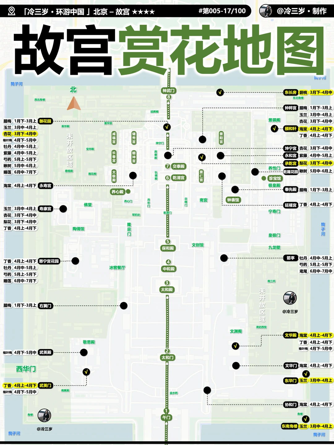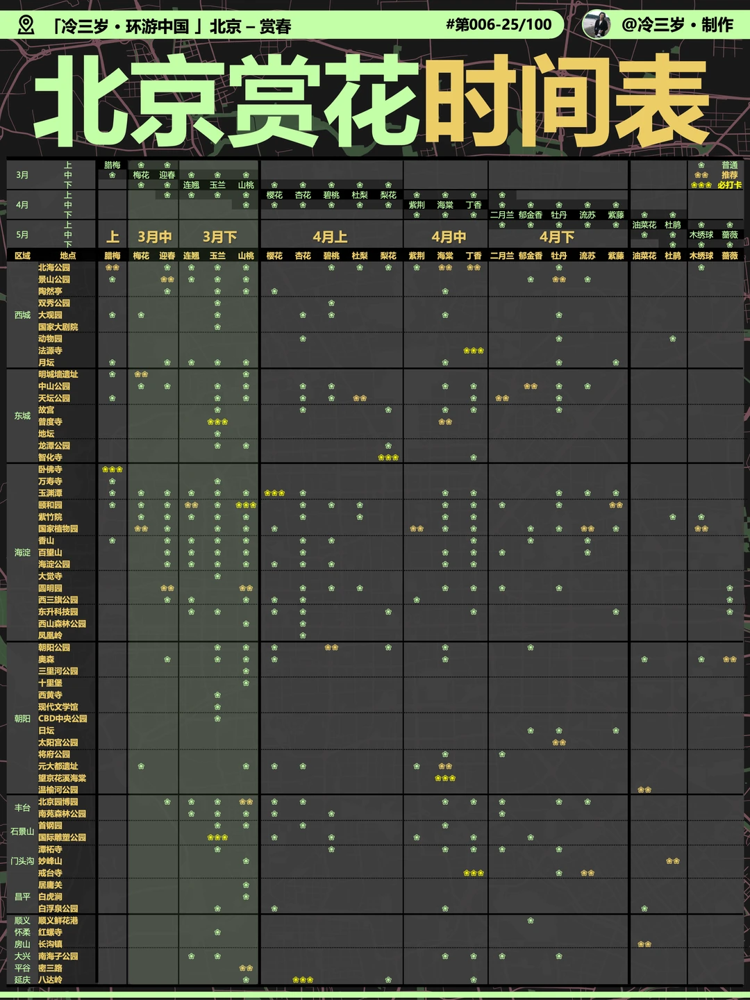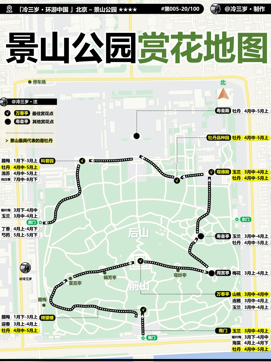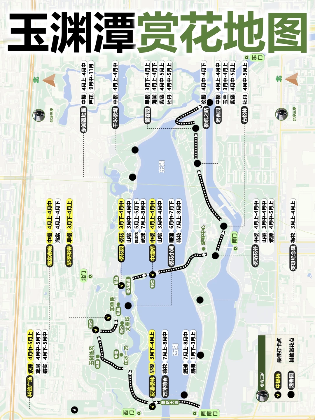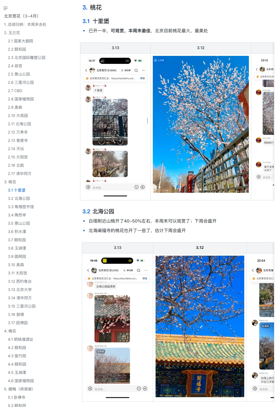 3月主要看梅花,山桃花,玉兰,我标记了开放情况(黄色是这周末就可以看但人多,白色开的不多但也可以去)