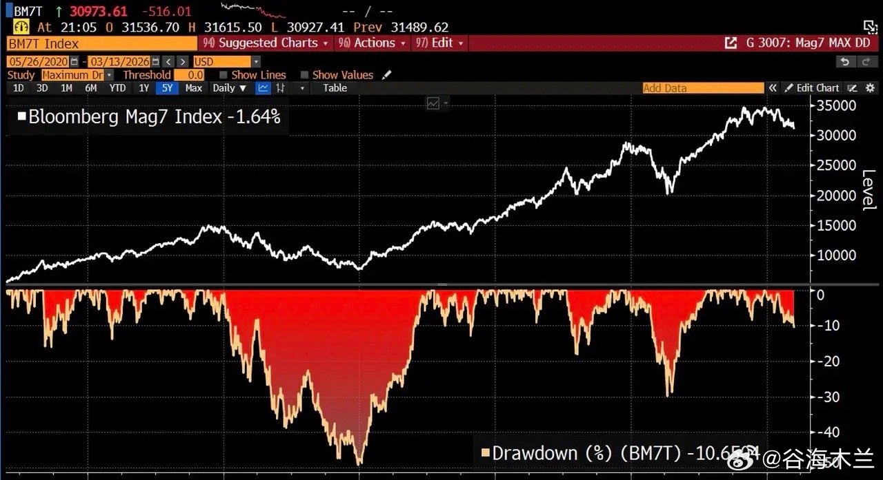 而就在3月13日美东收盘,追踪这七家公司的指数正式较去年10月的历史高点跌超10.6%,步入技术性回调区间,这也是这一明星组合数年来首次面临如此系统性的压力。
