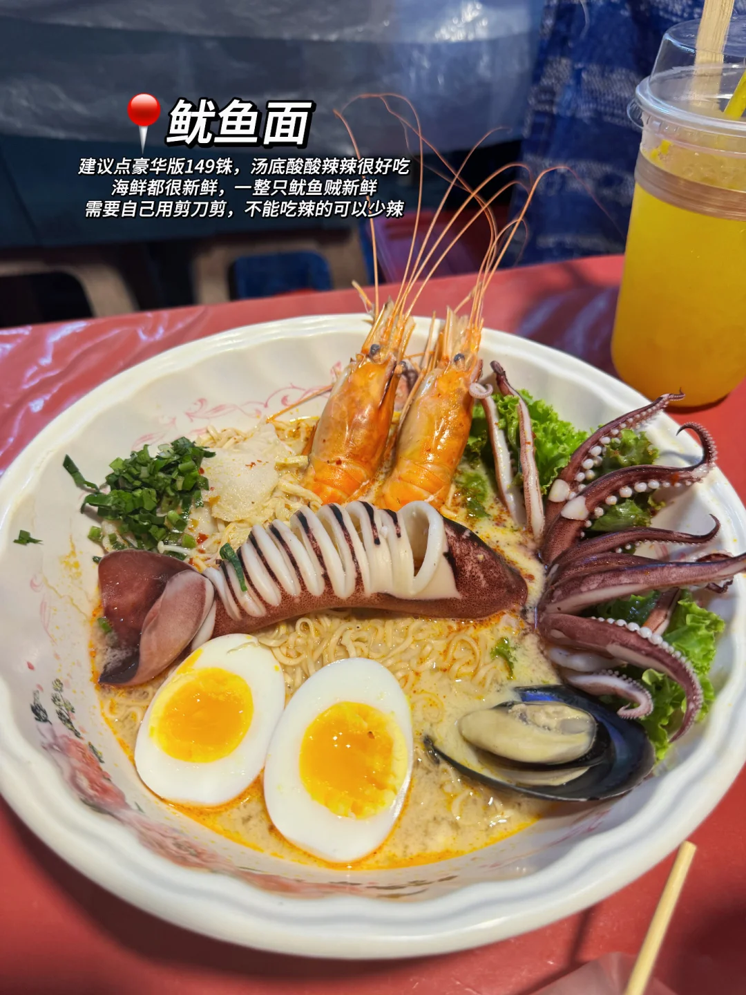 ✅鱿鱼面:推荐点豪华版149铢,汤底酸辣够味,海鲜新鲜,一整只鱿鱼超满足👏