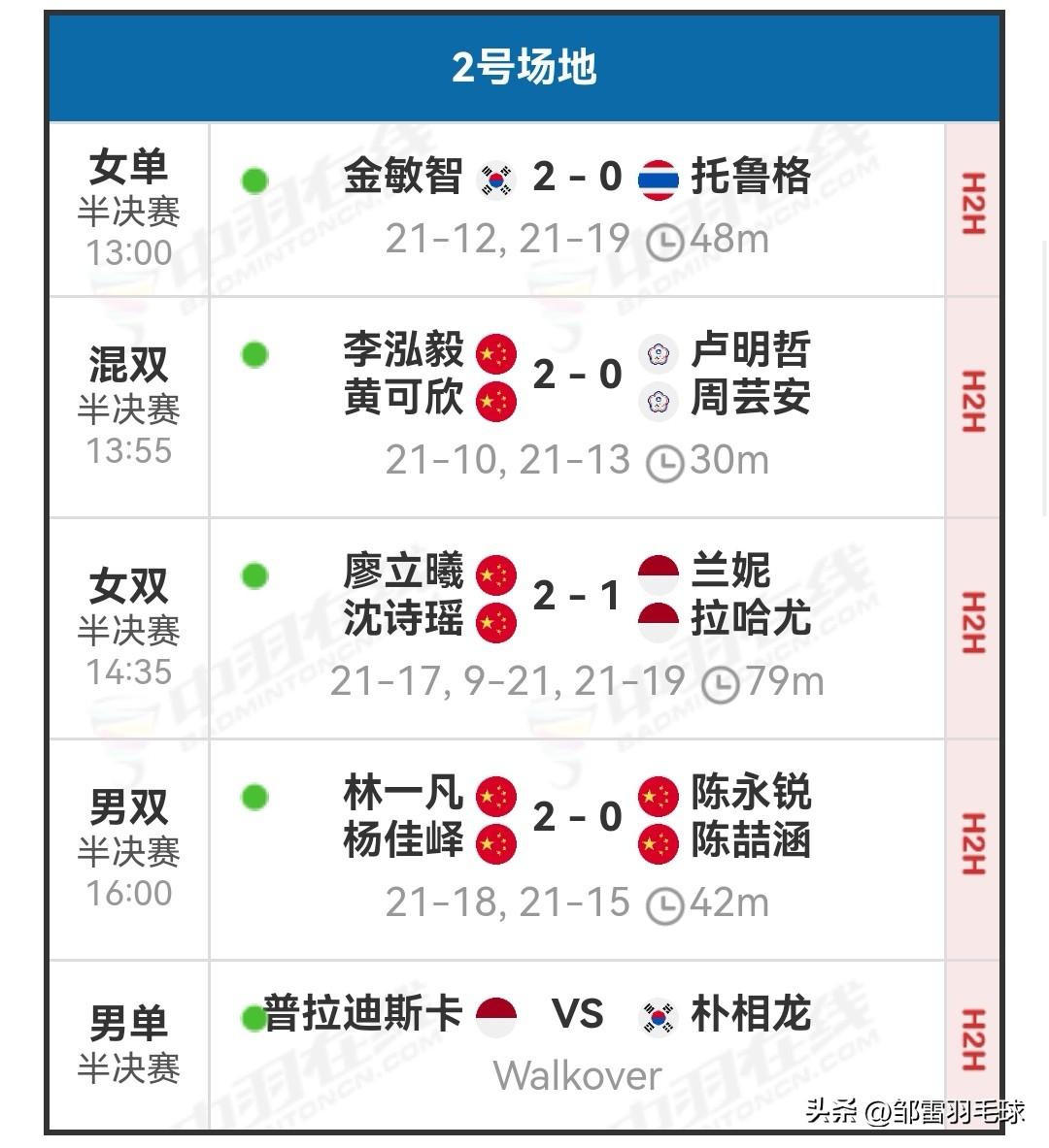 3月15日瑞昌羽毛球大师赛决赛安排 今天半决赛中国羽8胜1负,外战全胜,沈烜垚/唐睿芝激战三局击败韩国李钟民/李幽琳;任何组合大战三局成功逆转省队林嘉彦/林永晟;廖立曦/沈诗瑶苦战三局拿下印尼兰妮/拉哈尤,林一凡/杨佳峄两局击败队友陈永锐/陈喆涵,其他国羽选手均轻松击败各自对手,成功晋级决赛。 明天北京时间13:00开始,进行决赛,国羽全力冲五金,孙超vs普拉迪斯卡,徐文婧vs金敏智,男双、女双和混双国羽已提前锁定冠亚军,加油,中国队!明天决赛详细对阵安排和今天详细战报如图。 羽毛球 羽毛球爱好者 羽毛球比赛 羽毛球赛事 羽毛球赛程 国羽 国羽加油 国产羽毛球品牌有哪些2026年瑞昌羽毛球大师赛