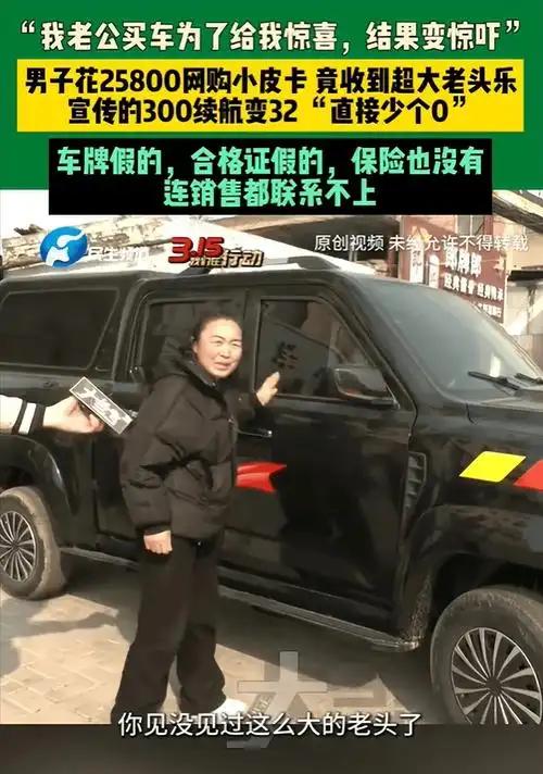 花25800元网购的“大皮卡”竟是无法上路的“老头乐”,河南开封一男子遭遇购车骗局。 近日,河南开封一男子在网络上花费25800元购买了一辆所谓的大皮卡,结果收到的却是无法上路的“老头乐”。该事件引起了广泛关注,揭露了低价新能源代步车市场中的欺诈行为。起初,男子因想要给妻子一份惊喜,选择通过短视频平台的直播间下单,主播承诺车辆续航300公里且可以上牌,价格比实体店便宜。然而,当车辆送达时,男子发现这辆车不仅外观粗糙,而且实际续航能力仅为32公里,远远低于宣传。更严重的是,随车的车牌和合格证均为伪造,无法办理合法手续,存在巨大安全隐患。此事不仅反映了商家的诚信问题,还警示消费者在网购时需谨慎辨别商品的真实性和合法性。 老年老头乐车 老年代步车骗局