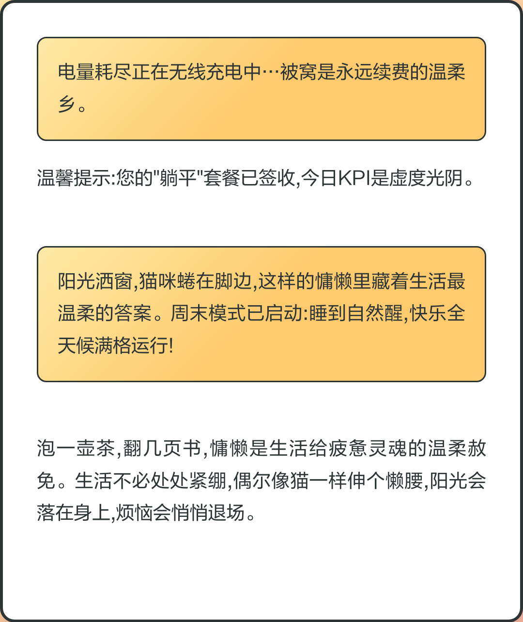 卷不动的年轻人决定一懒到底 阳光洒窗,猫咪蜷在脚边,这样的慵懒里藏着生活最温柔的答案。泡一壶茶,翻几页书,慵懒是生活给疲惫灵魂的温柔赦免。慵懒生活的温柔答案,喜欢的建议点赞收藏。