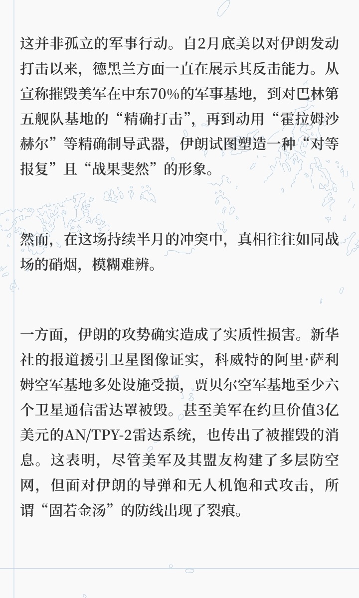 一方面,伊朗的攻势确实造成了实质性损害。新华社的报道援引卫星图像证实,科威特的阿里·萨利姆空军基地多处设施受损,贾贝尔空军基地至少六个卫星通信雷达罩被毁。甚至美军在约旦价值3亿美元的AN/TPY-2雷达系统,也传出了被摧毁的消息。这表明,尽管美军及其盟友构建了多层防空网,但面对伊朗的导弹和无人机饱和式攻击,所谓“固若金汤”的防线出现了裂痕。
