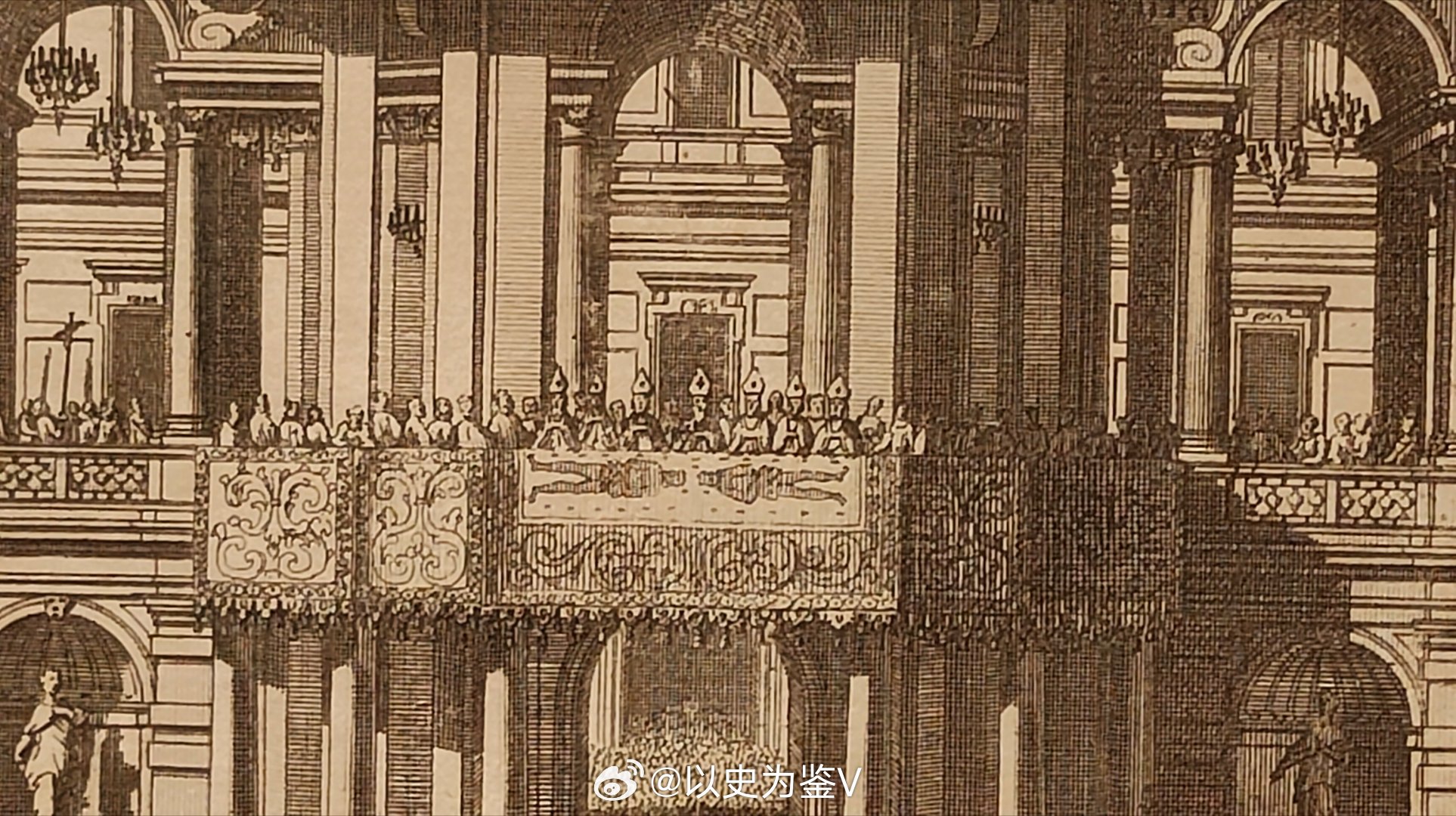 这幅画上就画的是当时的都灵广场,枢机主教和六位主教一起向下方的无数信徒展示这块圣裹尸布。