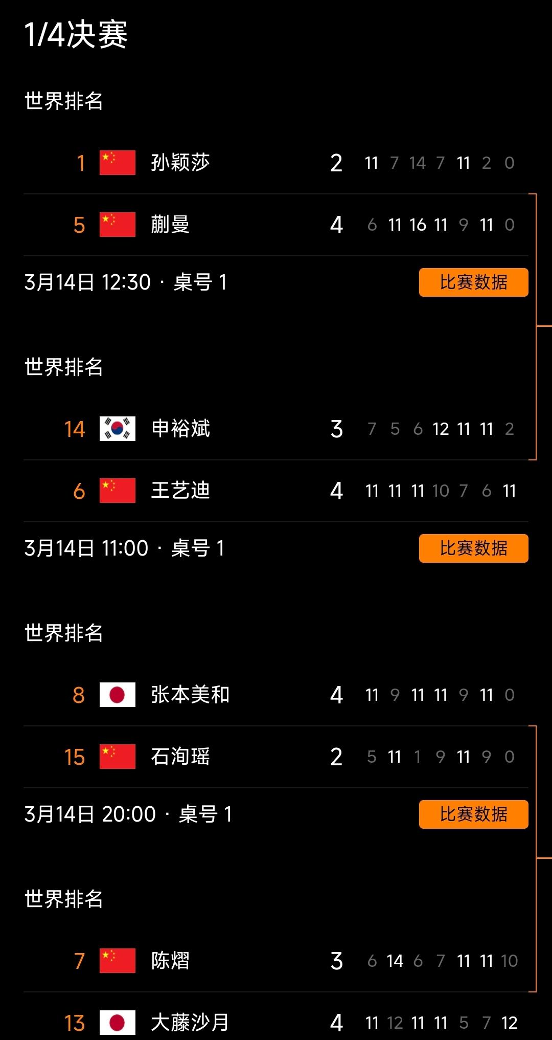 重庆冠军赛女单八强战落幕 国乒锁定四强半壁江山 半决赛迎中日对决 北京时间3月14日,2026年重庆乒乓球冠军赛女单1/4决赛激战收官,国乒选手发挥一半一半,在四场对决中拿下两场胜利,成功锁定半决赛两个席位,与日本选手会师最终四强。 首场1/4决赛中,世界排名第6的王艺迪迎战韩国选手申裕斌,双方苦战七局,王艺迪在比分交替领先的情况下顶住压力,以4-3(11-7、11-5、11-6、10-12、7-11、6-11、11-2)逆转取胜,率先晋级四强。 随后,世界排名第1的孙颖莎与队友蒯曼展开内战,蒯曼凭借更稳定的发挥,以4-2(11-11、7-7、16-14、11-7、9-11、11-2)击败孙颖莎,爆出冷门。 晚间场次,张本美和与石洵瑶的对决同样胶着,日本选手以4-2(11-5、9-11、11-1、11-9、9-11、11-9)战胜中国选手石洵瑶;另一场中日对抗中,大藤沙月以4-3(12-6、12-14、11-6、11-7、5-11、7-11、12-10)险胜陈熠,与张本美和携手晋级。 至此,半决赛对阵出炉: 蒯曼 vs 王艺迪(国乒内战) 张本美和 vs 大藤沙月(日本内战) 两场比赛将于3月15日先后在1号球台打响。 国乒内战将确保一张决赛门票,而日本选手的对决则将决出另一位决赛选手,中日巅峰对决有望在决赛上演。 本次赛事女单赛场竞争激烈,多位世界排名靠前的选手遭遇苦战,也让后续半决赛和决赛更具看点。