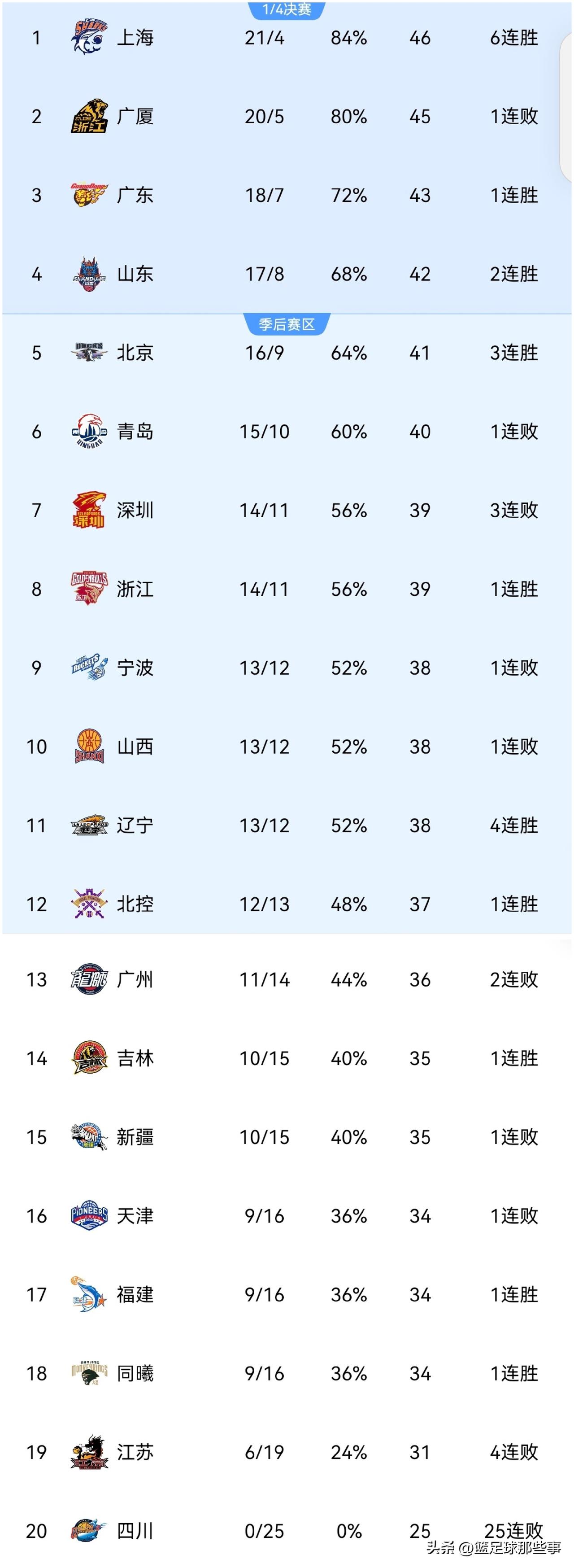 CBA最新积分榜: ✅广厦86:89加时惜败浙江,广厦滑落第2浙江升至第8,胡金秋14投8中得到29分13板仍难救主,塔克30分10助命中神奇三分拖进加时,林秉圣9投0中成为输球最大黑洞; ✅上海129:79狂胜副班长四川,取得6连胜升至榜首,上海队12人全部出场且全部得分,三分球命中率高达56.7%; ✅山东85:76力克青岛升至第4,这是一场卡位大战,山东外援克里斯砍下42分13板成为赢球最大功臣,高诗岩8投1中继续铁送出6助成遮羞布; ✅北京98:85击败广州3连胜升至第5,麦基渐入佳境9投8中砍下19分,陈盈骏送出13次助攻,方硕关键时刻挺身而出; ✅其他场次比赛结果,宁波76:77惜败福建4连胜遭终结;同曦93:84送江苏4连败,郭昊文得到30分,庞峥麟砍下20分5板8助。