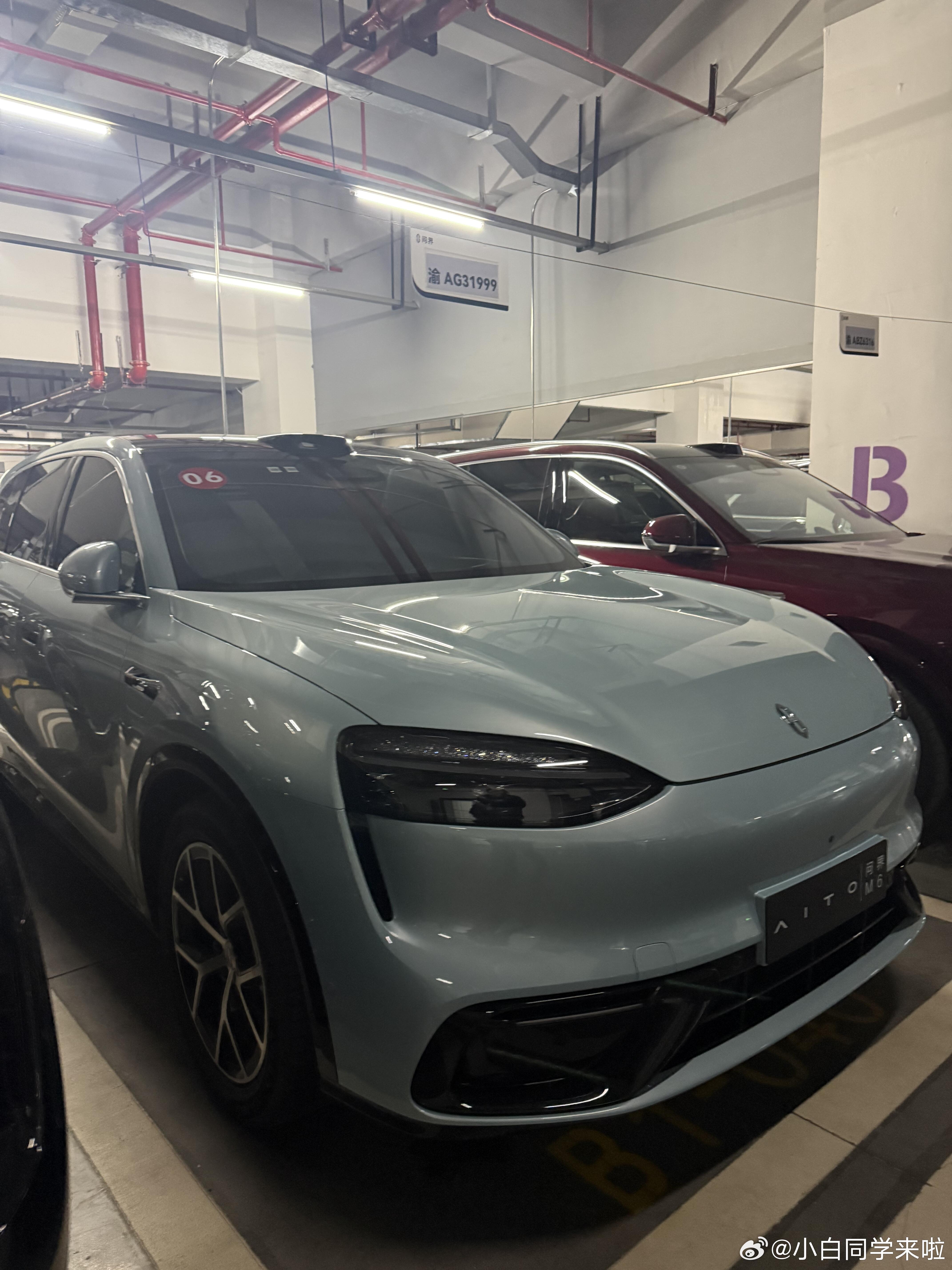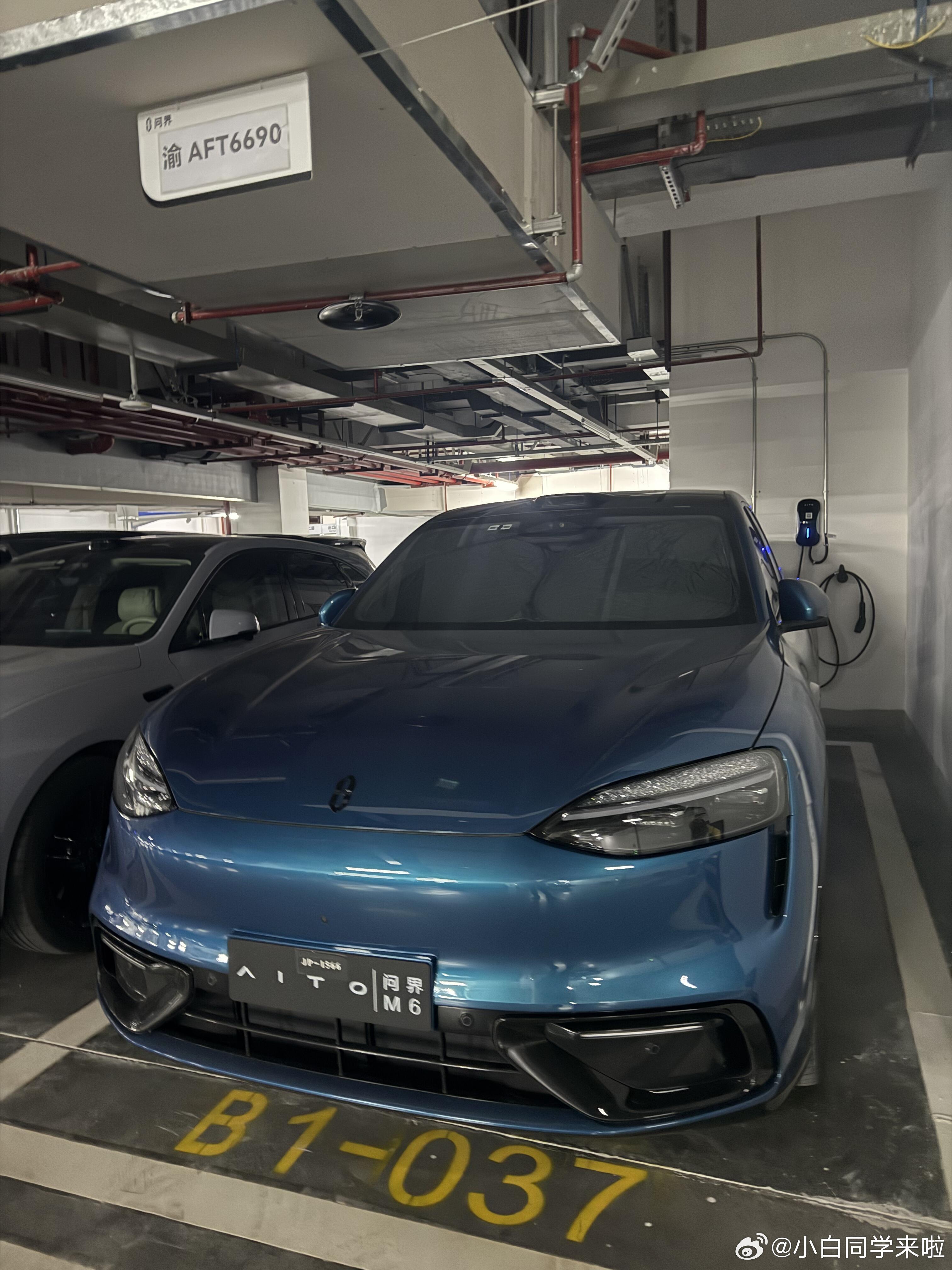 问界m6 脉冲蓝和流光青在地库实拍图。