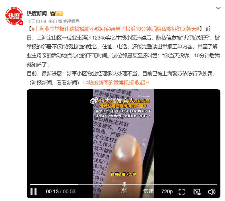 男子投诉10分钟后隐私被扒得底朝天 “涉事小区物业经理承认处理不当,目前已被上海警方依法行政处罚”按我的理解,行政处罚最重是行政拘留吧,这种处罚应该不能弥补物业经理及背后体制内一串人泄漏投诉人隐私,对公众造成的恶劣后果和对投诉人的伤害上海业主举报违建被威胁不敢回家,热点观点