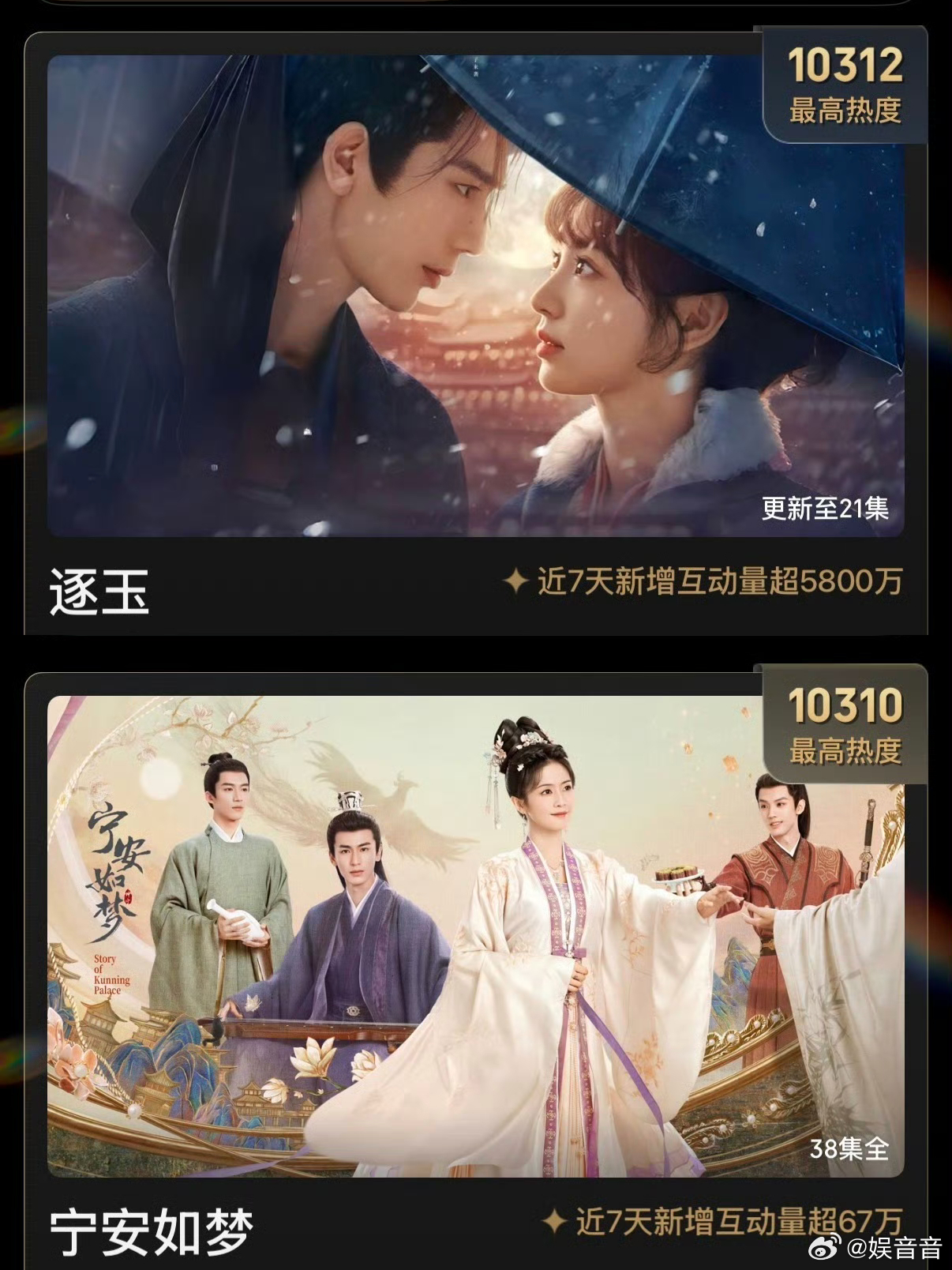 逐玉热度超过宁安如梦 两部都是用心制作的好剧,热度高是必然!支持张凌赫,支持每一部优秀作品!