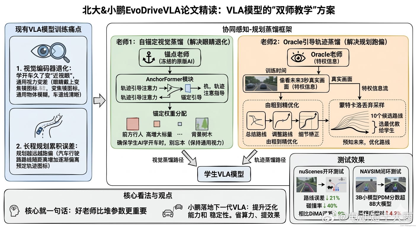 小鹏如果能把这个蒸馏框架落地到下一代VLA,智驾的泛化能力和稳定性应该还能再拔一截。毕竟现在各家都在卷端到端,谁能把"老师教学生"这套玩明白,谁就能省算力、提效果。