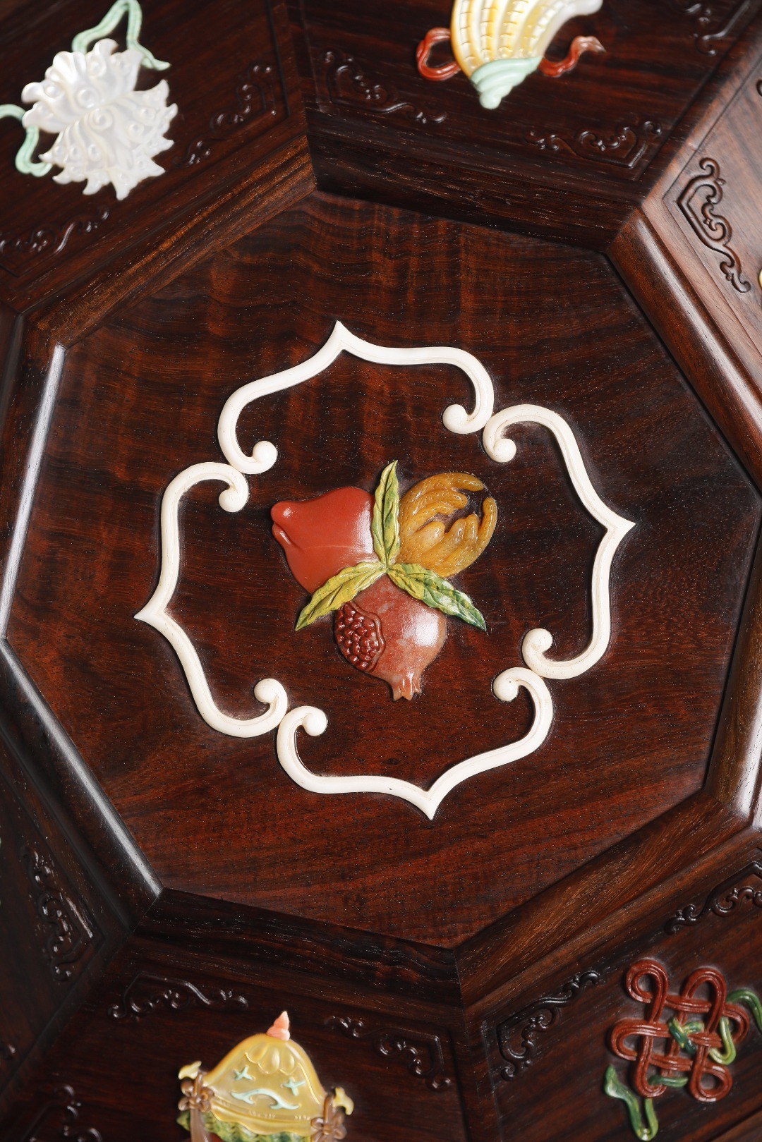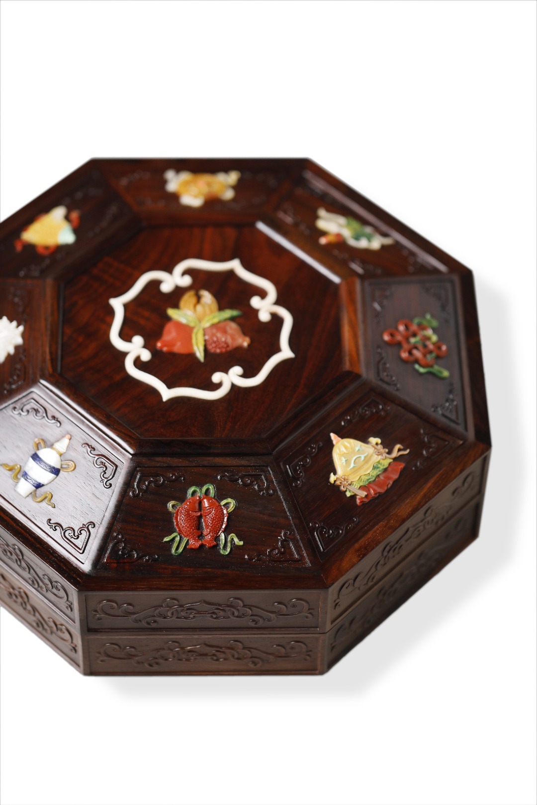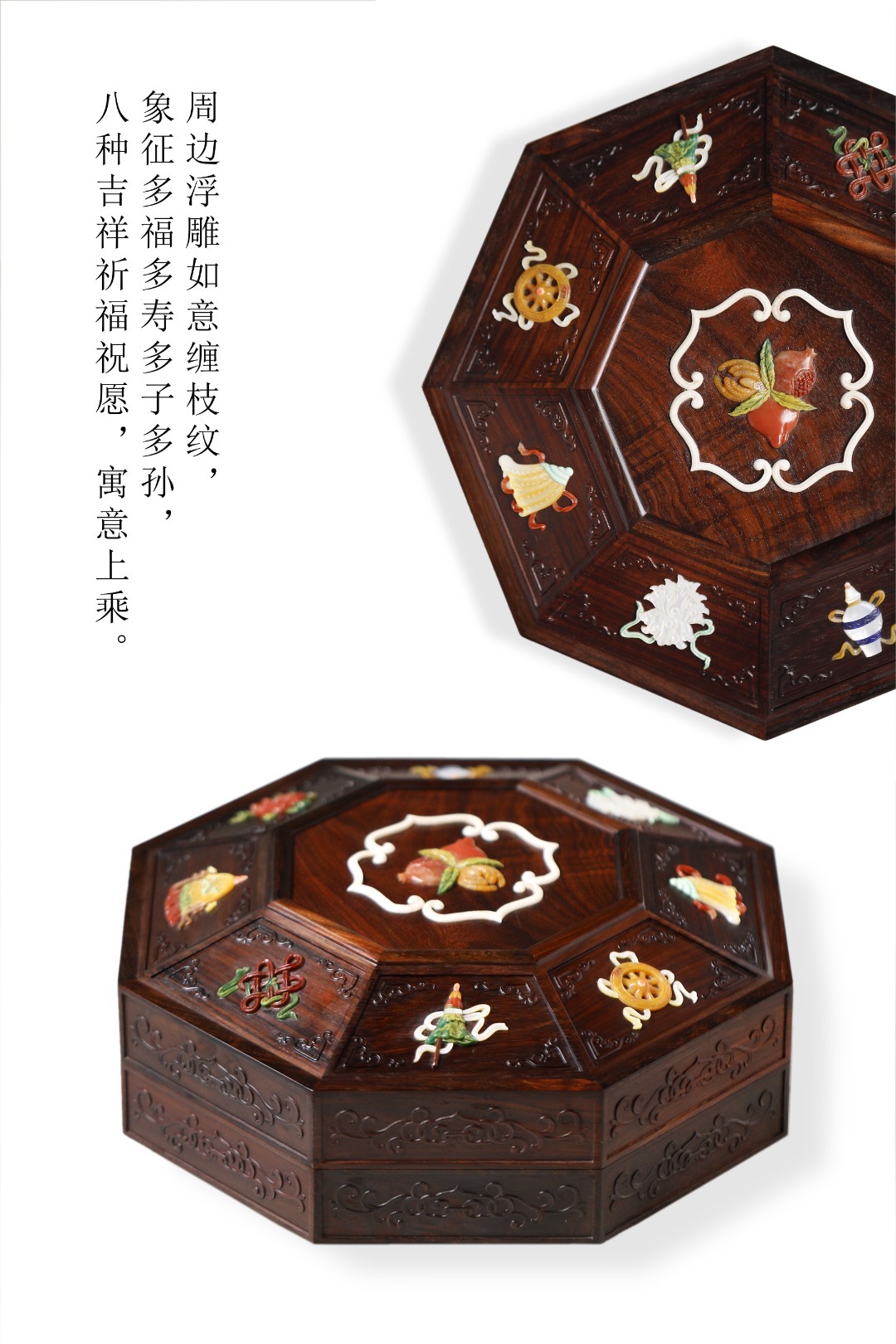 大红酸枝独板全榫卯制作,盒盖百宝嵌三多八宝纹,周边浮雕如意缠枝纹,象征多福多寿多子多孙,八种吉祥祈福祝愿,寓意上乘。