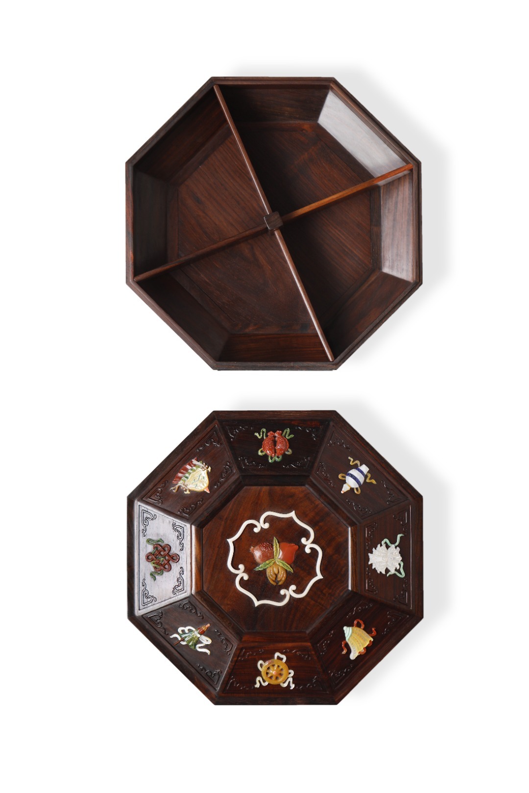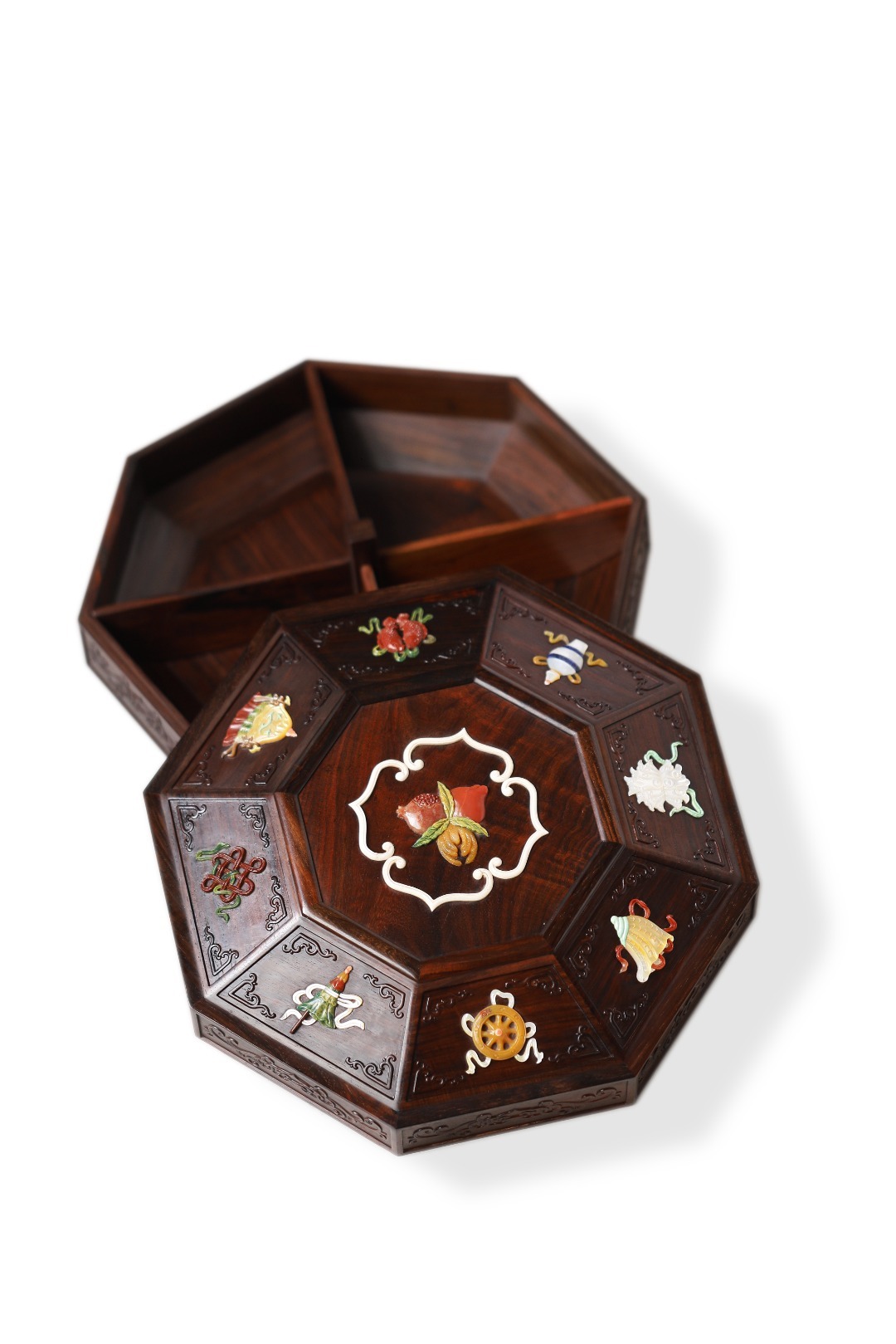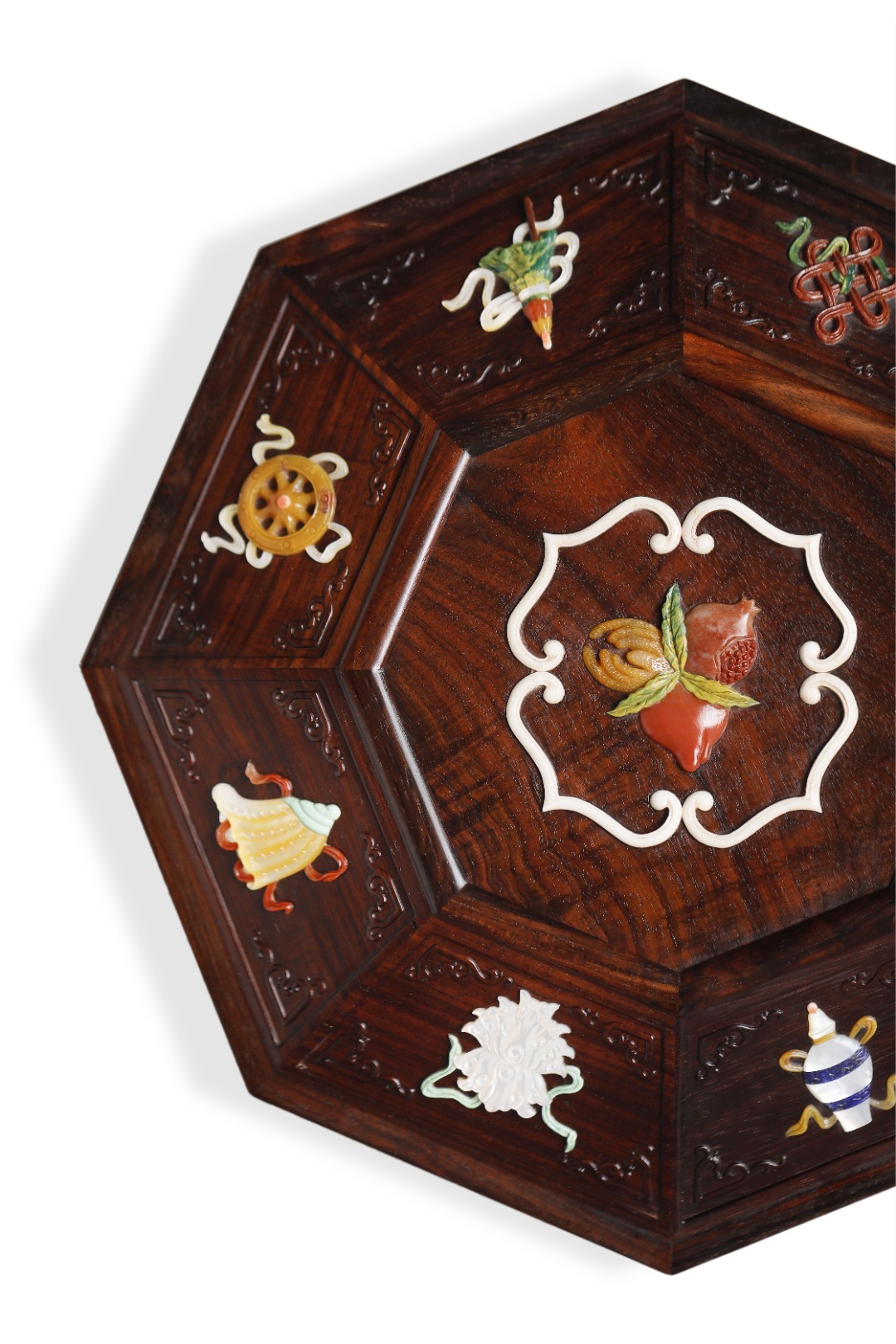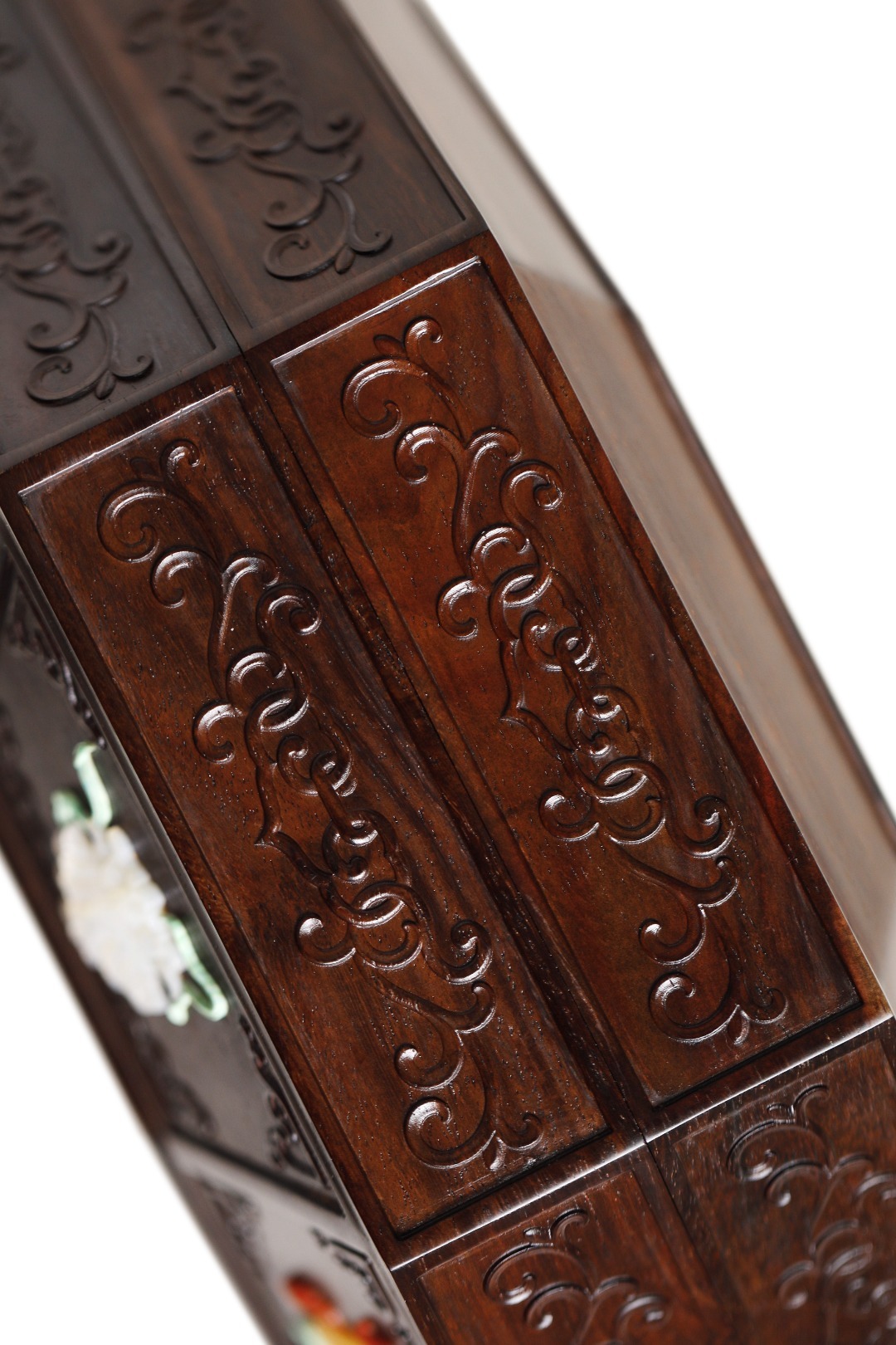 大红酸枝独板全榫卯制作,盒盖百宝嵌三多八宝纹,周边浮雕如意缠枝纹,象征多福多寿多子多孙,八种吉祥祈福祝愿,寓意上乘。