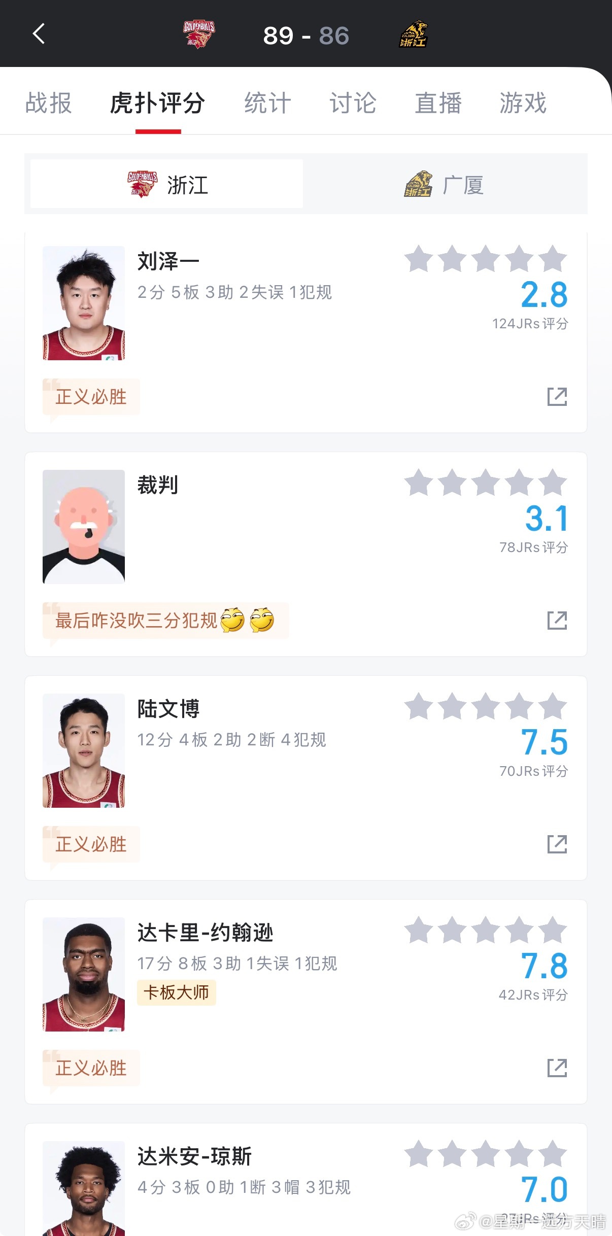 CBA联赛 稠州的评分里全是“正义必胜”,难道他们也发现广厦赢球主要靠黑哨啦?C