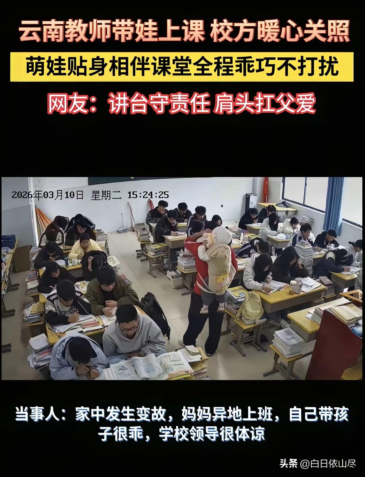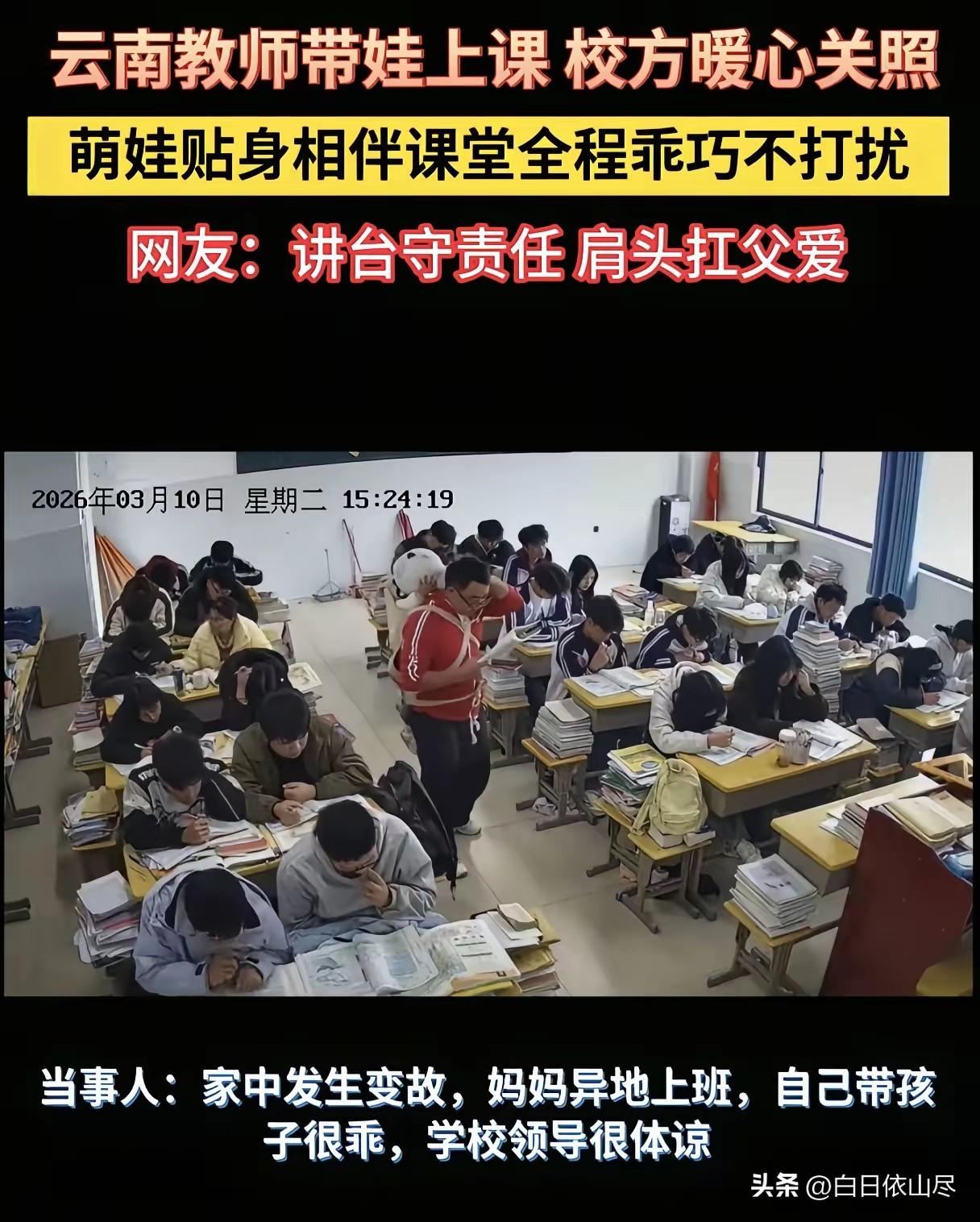带着孩子给学生上课的老师火了,却遭到质疑而删除了视频!原来孩子妈妈也是老师,异地工作,家里老人去世了,孩子特别黏妈妈,如果跟着妈妈,妈妈就没法上课了,但是跟着自己就很乖! 云南一所学校的一间教室里,出现了一幅让无数人既心酸又感动的画面。一位男老师站在讲台上,正有条不紊地讲解着知识点,手里还小心翼翼抱着一个年幼的孩子。 这个小小的身影安安静静地依偎在老师怀里,不哭不闹,全程乖乖陪着上课,与台下认真听讲的学生完美融合,构成了一幅和谐又罕见的课堂景象。 这位老师的遭遇,揭开了背后一段让人鼻酸的故事。他是当地一名普通的乡村教师,平日里兢兢业业,对学生耐心负责。 然而,天有不测风云,家中突然遭遇变故,让他陷入了前所未有的困境。孩子的妈妈因为工作原因,不得不远赴异地上班,夫妻两人被迫开启异地生活模式。 家里原本负责照看孩子的长辈,也因变故无法再提供帮助,一时间,年幼的孩子失去了所有能依赖的看护者。 孩子年纪尚小,正是最缺乏安全感的时候,脱离熟悉的环境后,情绪极不稳定。如果把孩子独自留在家中,安全隐患让人无法放心; 送去托儿所或托养机构,既不符合家庭实际情况,也担心孩子适应不了。在生活的重重难关面前,这位老师没有选择逃避,也没有向学校过多抱怨,而是默默寻找解决办法。 经过反复权衡和内心挣扎,他最终做出了一个让所有人都敬佩的决定——带着孩子来学校上课。课堂上,他一边要维持课堂秩序,把控教学节奏,确保学生的听课质量;一边又要时刻留意怀里的孩子,保证他的安全和情绪。 好在这个孩子格外懂事,仿佛知道爸爸的不易,小小年纪就展现出超乎年龄的乖巧。在教室里,他安安静静,从不随意哭闹打扰课堂,也不乱跑乱动,就那样安安静静地陪着爸爸,成了课堂上最特殊的“旁听生”。 学校领导在得知这一情况后,没有丝毫的指责和为难,反而展现出极大的体谅与善意。 学校特意为老师调整了部分课程安排,尽量减少他的教学压力,同时在校园内给予他最大的便利,让他能够安心带着孩子工作。 领导的理解和支持,像一股暖流,温暖了这位正处于困境中的老师,让他在艰难的日子里感受到了组织的关怀。 学生们也格外懂事,大家知道老师的难处,课堂上格外专注,从不捣乱,有的学生还会悄悄关心老师和孩子的情况,师生之间多了一份温情与默契。 这条视频被拍摄下来传到网上后,迅速引发全网关注。大家纷纷为这位负责任的老师点赞,感叹他的担当与不易,同时也对学校领导的暖心举动表示赞赏。 在成年人的世界里,谁都可能遭遇突如其来的变故,这位老师没有被困难打倒,而是拼尽全力兼顾工作与亲情,用自己的方式守护着学生和孩子。 学校的包容与体谅,也让我们看到了教育行业的温度。生活或许会有坎坷,但总有关爱与温暖在身边支撑着我们前行。 对此,你们有什么看法,欢迎评论留言~