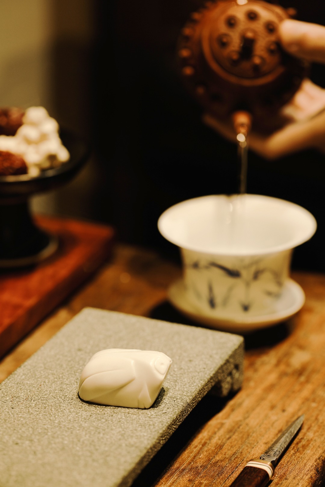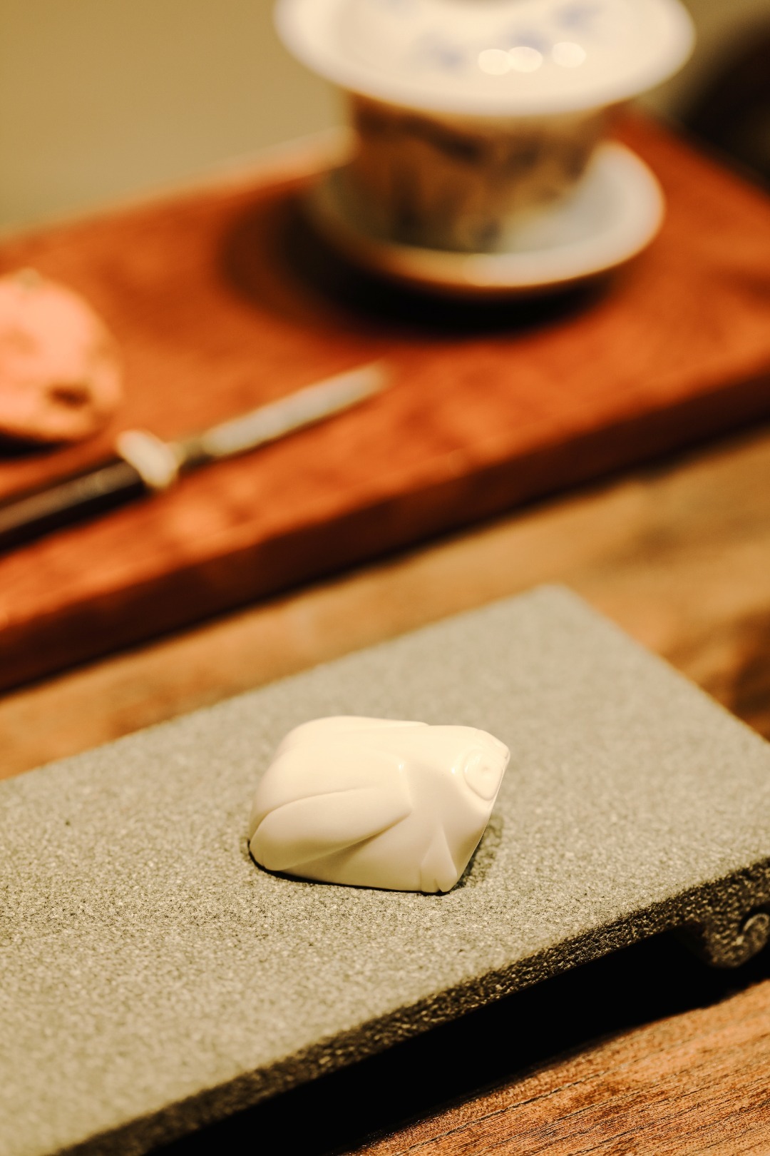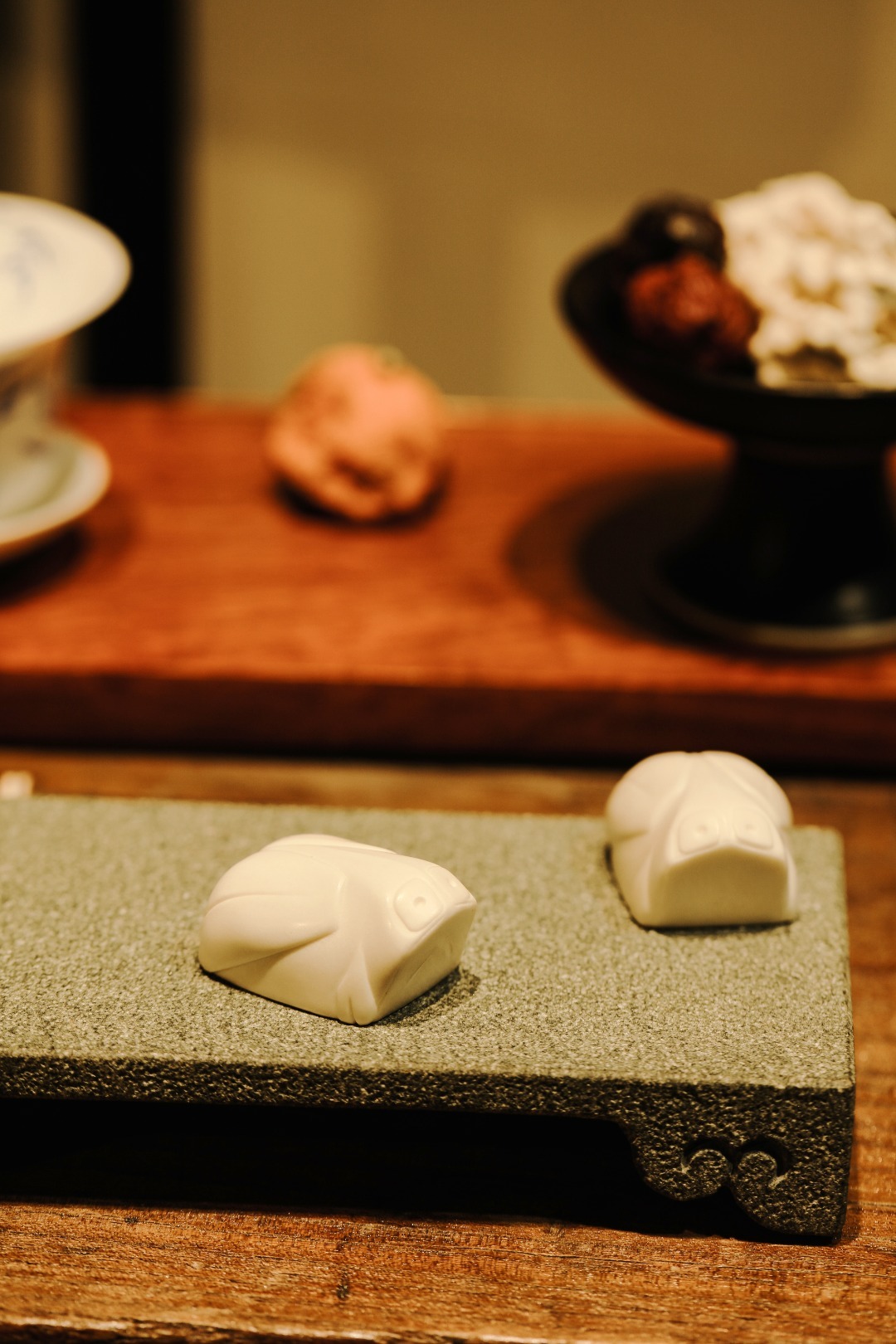 鹿角 | 仿古蛙料质清润洁白,快刀雕刻古蛙,神情姿态虽静犹动,炯炯有神。置于茶席
