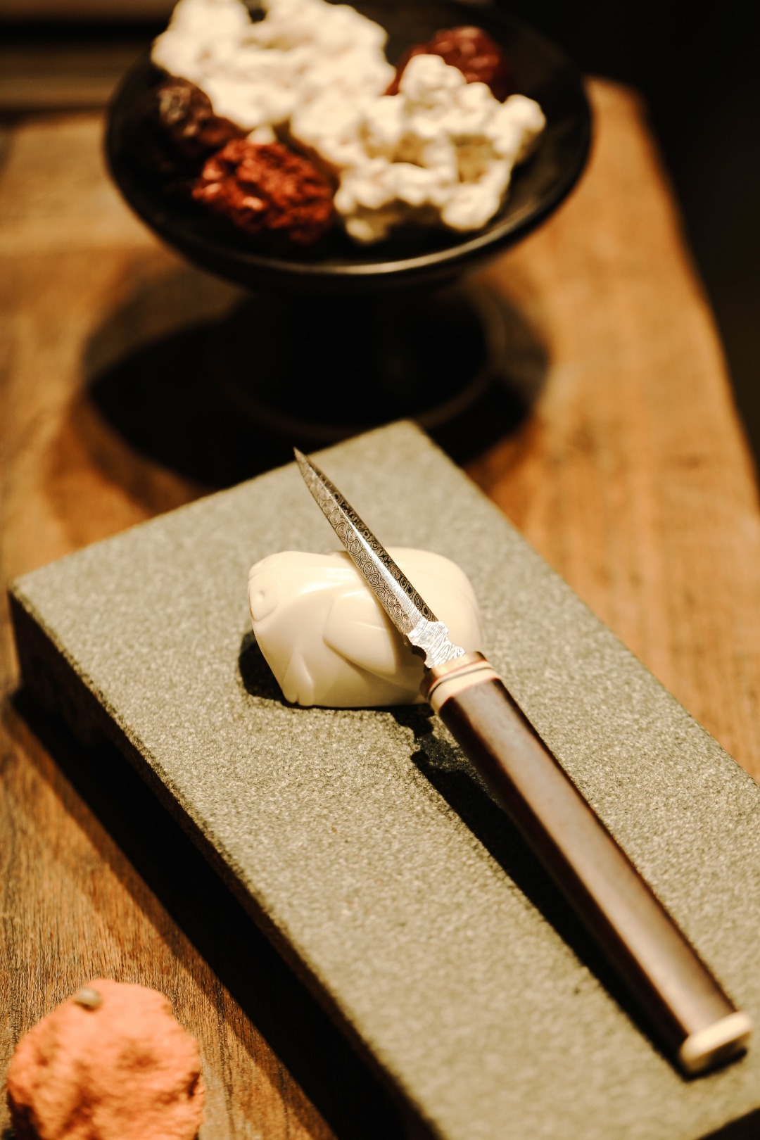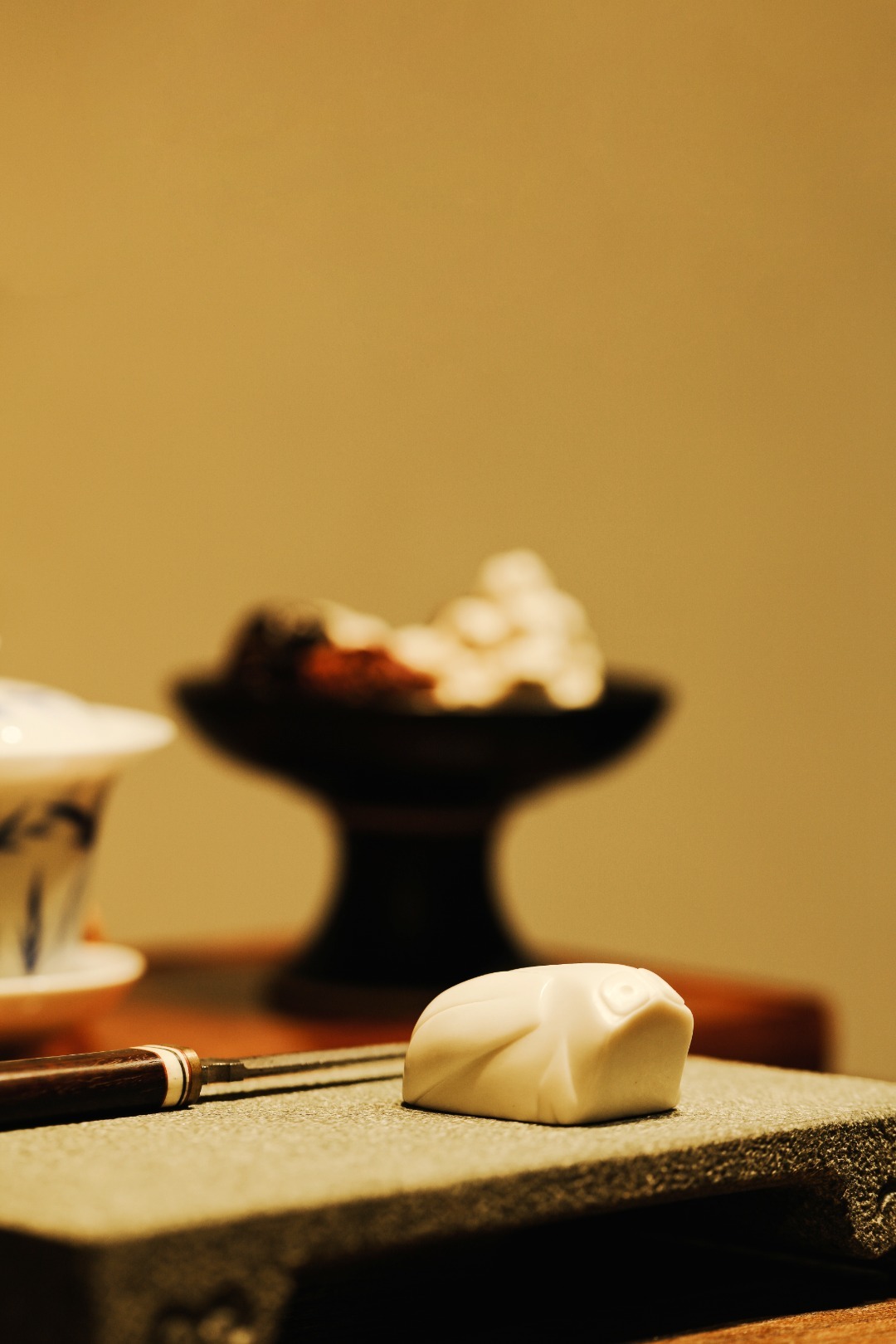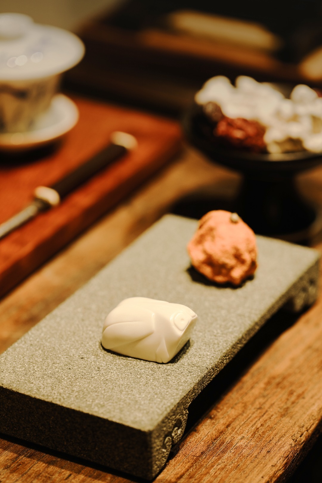 鹿角 | 仿古蛙料质清润洁白,快刀雕刻古蛙,神情姿态虽静犹动,炯炯有神。置于茶席