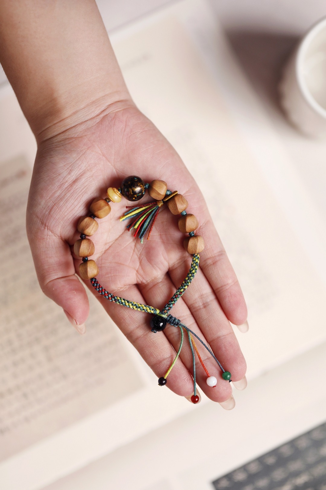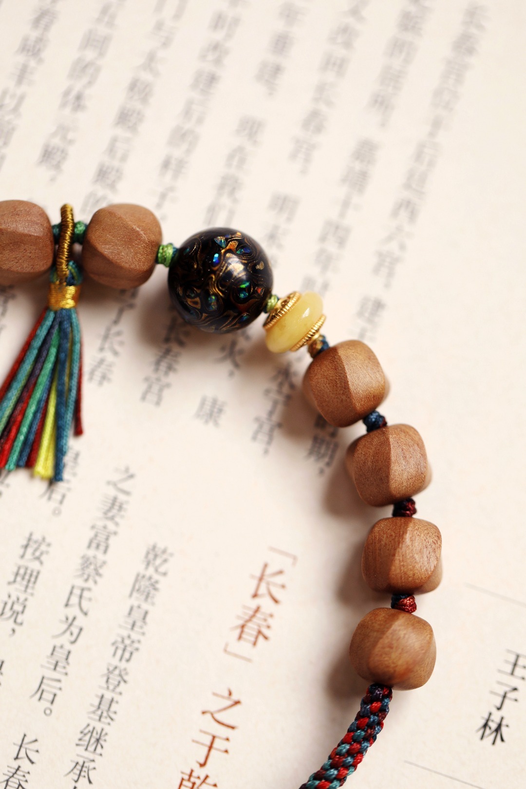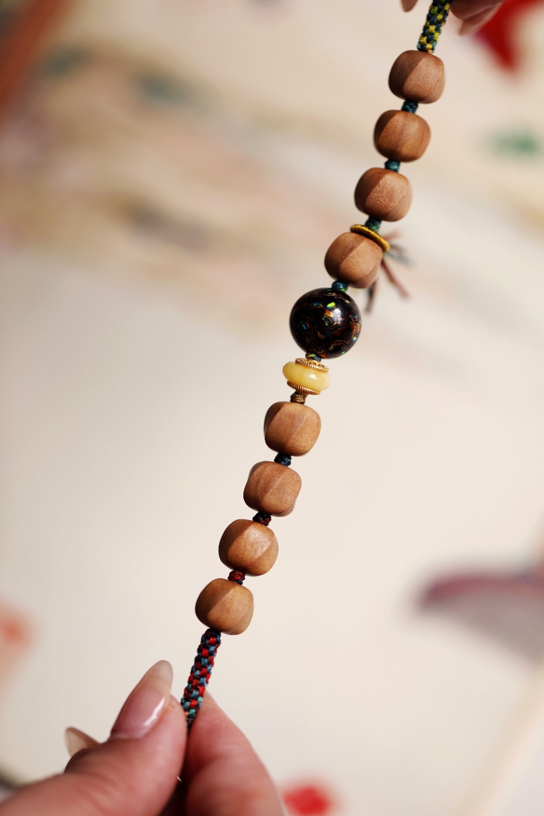老山檀香,香韵迷人,搭配贝壳珠、玛瑙等配饰;把玩之间,香气浓郁透体,寓吉祥、平安健康。