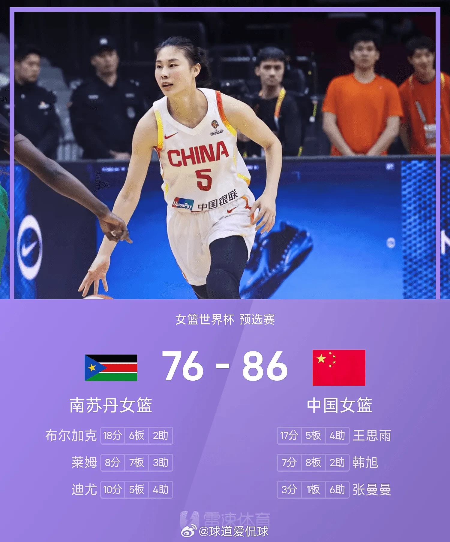 首节比赛,罗欣棫连中两记三分球帮助中国女篮打出梦幻开局,而南苏丹女篮凭借加克登的个人能力缩小分差。首节后半段,李月汝补防被吹个人第三犯,杨舒予与王佳琦命中三分扩大领先优势。首节战罢,中国女篮22-15领先南苏丹女篮。篮球 体育 CBA 女蓝