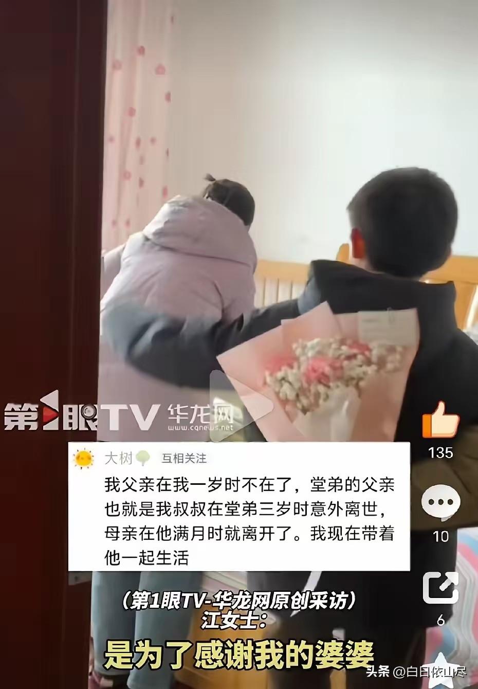 湖北,女子1岁时父亲离世,女子的叔叔对于她很多照顾。堂弟3岁时,女子的叔叔也离世了,堂弟的母亲早在堂弟满月就离开了,女子把堂弟带在了身边,女子结婚,征得婆婆的同意,女子带着堂弟到婆家生活了多年,婆婆对女子堂弟视为己出。三八妇女节,女子堂弟的一个举动,让女子婆婆泪目了。 女子在刚满一岁的时候,父亲就因病离开了人世,成长路上缺少父爱陪伴的她,一直被叔叔默默照顾着。 叔叔心疼年幼的侄女失去父亲,平日里处处关心,生活上给予帮扶,让她在缺失父爱的时光里,感受到了来自亲人的温暖。这份来自长辈的守护,在女子心里埋下了善良的种子,也让她格外看重亲情。 命运并没有善待这个普通的家庭,在女子慢慢长大的过程中,家庭再遇变故。堂弟三岁那年,照顾她长大的叔叔也不幸离世,让这个本就脆弱的家庭雪上加霜。 更让人心疼的是,堂弟的母亲在孩子刚满月时就选择离开,年幼的堂弟一夜之间成了无依无靠的孩子,身边再没有直系亲人照料。 看着和自己有着相同遭遇的堂弟,女子没有丝毫犹豫,主动把堂弟带在了身边照顾。 她深知失去亲人的痛苦,不愿让堂弟再经历自己小时候的无助,从那天起,她既是姐姐,也承担起了如同父母一般的责任,细心照料堂弟的饮食起居,陪着他慢慢长大。 时间一晃而过,女子到了谈婚论嫁的年纪,在组建新家庭之前,她没有选择放下堂弟,而是提前把要带着堂弟一起生活的想法,坦诚地告诉了未来的婆婆。 让她意外的是,婆婆没有丝毫反对,反而十分理解她的不易,欣然同意让堂弟一起进入新的家庭生活。 婚后多年,堂弟一直跟着女子在婆家生活,婆婆没有半点嫌弃,反而将堂弟视如己出,日常起居、上学吃饭都悉心照料,对待他和自家孩子没有任何区别。 在这个没有血缘牵绊却满是温暖的家里,堂弟渐渐长大,性格开朗懂事,也把婆婆当成了最亲近的长辈。 今年三八妇女节,一直被全家照顾的堂弟,用自己的方式表达着心中的感激。他提前准备了一份小小的礼物,用最质朴的行动向一直照顾自己的婆婆送上祝福,没有华丽的语言,却满含真心。 这个从小缺少亲人陪伴的孩子,用最简单直接的举动,回馈着多年来的养育之恩。 看到堂弟贴心的模样,婆婆瞬间红了眼眶,连日来的付出都化作了满满的感动。 一旁的女子也倍感欣慰,从年幼失去父亲,到被叔叔照顾,再到自己守护堂弟、被婆家包容,一路走来的坎坷与温暖,在这一刻都有了最好的答案。 没有血缘相连,却用真心相依;没有血缘牵绊,却用一生守护。这段发生在湖北普通家庭的故事,没有刻意煽情,却让每一个看到的人都心生暖意,也让大家看到了亲情最动人的样子。 对此,你们有什么看法,欢迎评论留言~