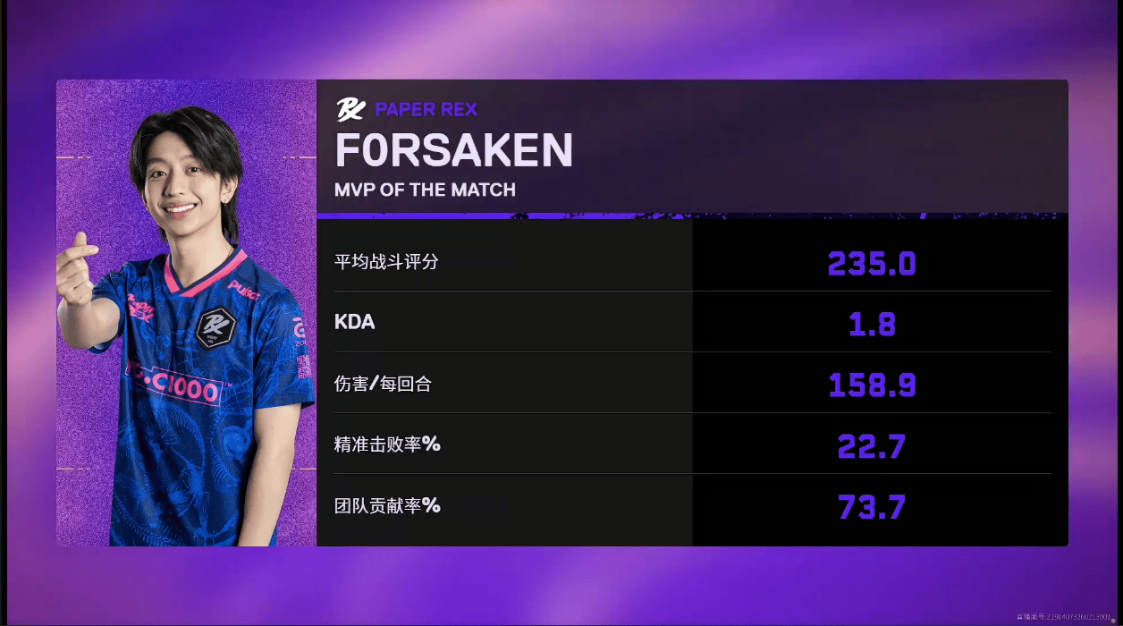 虎扑03月15日讯在刚刚结束的PRX对阵NRG的BO5比赛中,235战斗评分158回合均伤,f0rsakeN斩获PRX对阵NRG图三MVP