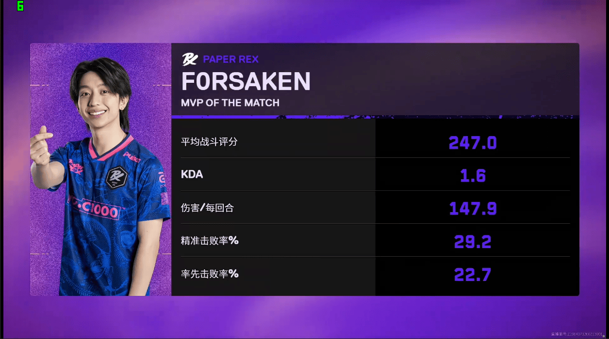虎扑03月15日讯在刚刚结束的PRX对阵NRG的BO5比赛中,247战斗评分147回合均伤,f0rsakeN斩获PRX对阵NRG图四MVP