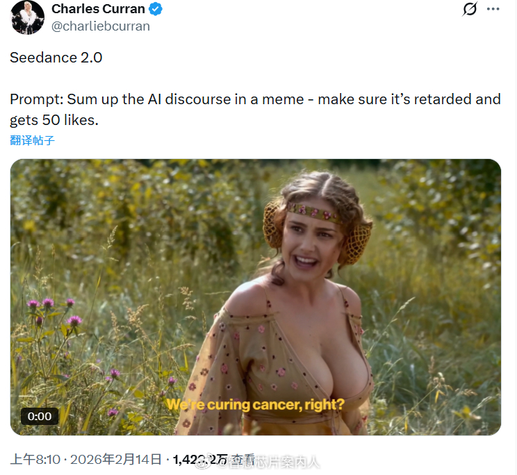 X博主导演Charles Curran在2月14日用Seedance2.0做了一段视频,X竟然给了26,930美元的奖励。这段视频改编自《星球大战前传2》主角帕德梅和安纳金的一段对话,竟然病毒式传播,光帖子就有1400万次的阅读,视频浏览次数更是不可统计。