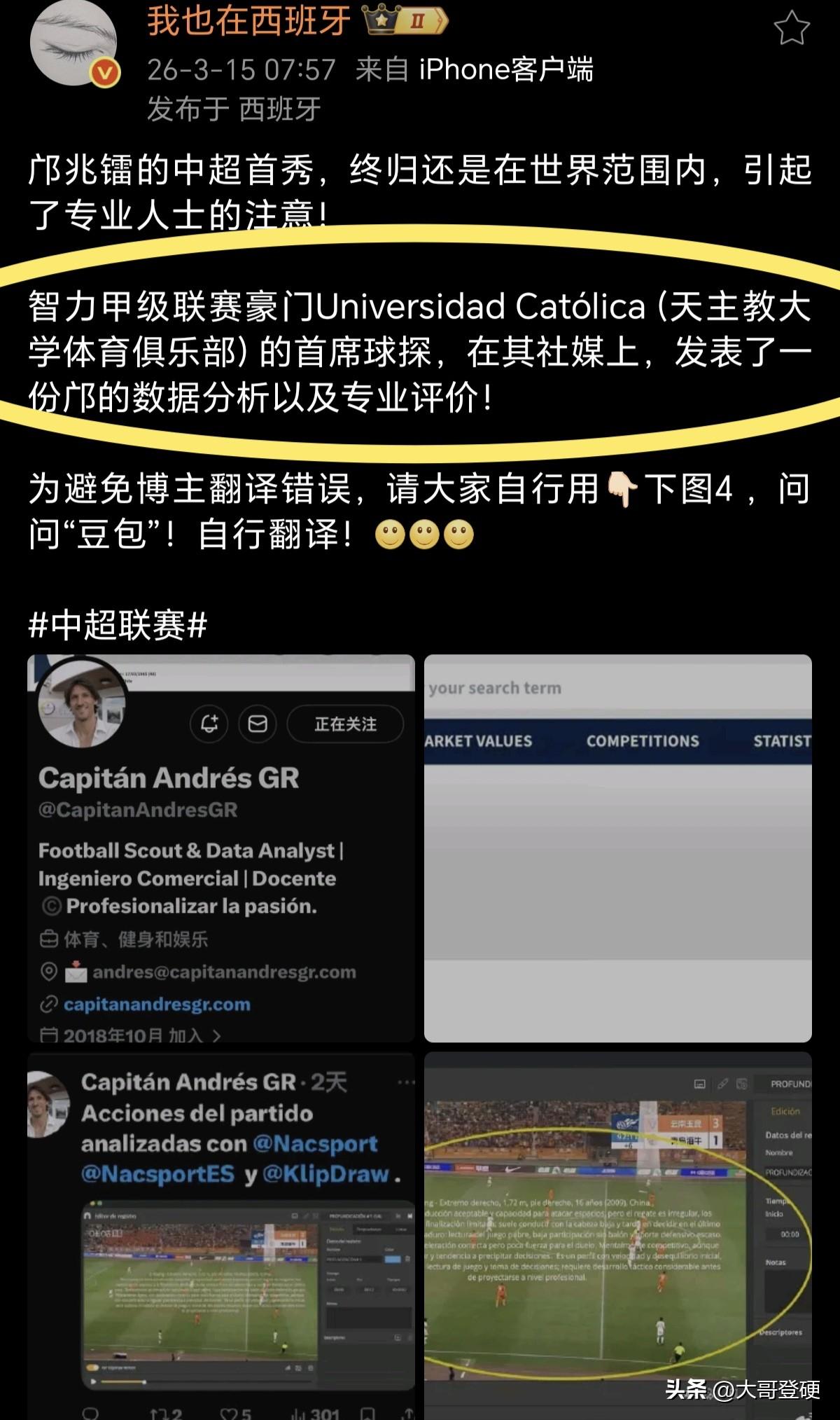 关于邝兆镭中超首秀!看看智利豪门首席球探是如何点评的[吃瓜群众] 近日,随着邝兆镭的中超首秀落幕,不但国内各路自媒体各种神夸,甚至连国外的球探也跑出来凑热闹了[捂脸] 据知名博主“我也在西班牙”消息, 智利甲级联赛豪门Universidad Católica(天主教大学体育俱乐部)的首席球探,在其个人社交媒体上,发布了关于邝兆镭的相关信息[强] 一起看看智利甲级联赛豪门俱乐部首席球探,给邝兆镭在中超首秀的数据分析和专业评价[震惊] 拿豆包简单翻译了一下,怎么感觉给出的评价,好像缺点远大于优点呢[晕] 不知这个智利豪门俱乐部的首席球探,不会不懂球吧[吃瓜群众]