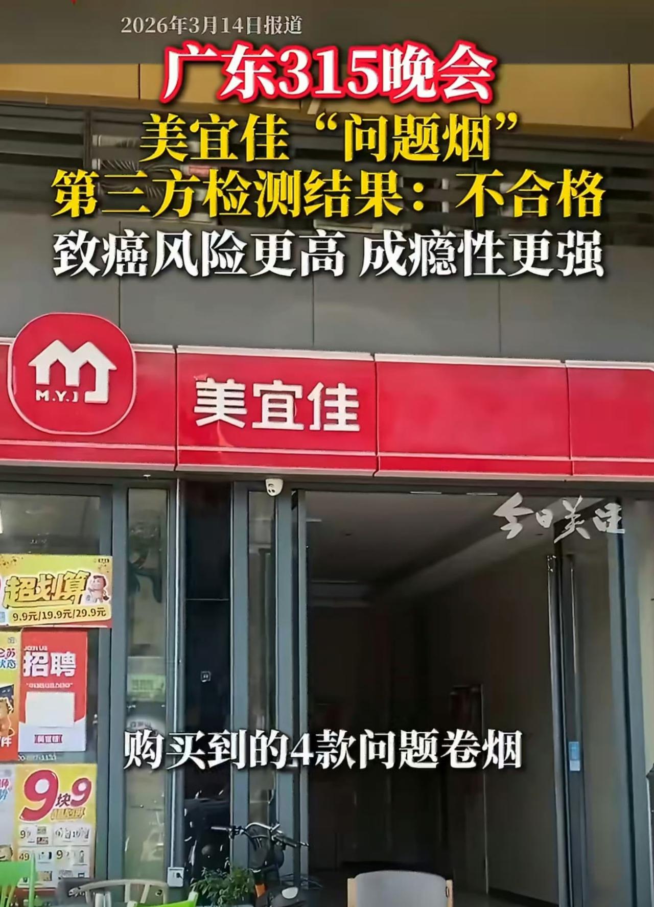 315刚曝光,全网都炸了!广东315晚会直接点名:记者在广州、佛山、东莞暗访10家美宜佳,10家全卖假烟,没有一家幸免! 作为全国门店最多、突破4万家的便利店巨头,美宜佳本来是大家下班、宵夜、应急买东西最放心的地方,尤其是买烟,很多人认准连锁便利店,觉得靠谱、不会踩坑。可谁能想到,最信任的家门口小店,居然成了假烟重灾区。 这次曝光太触目惊心: 10家店当场查出854包假烟,利群、煊赫门、经典1906这些常抽的牌子全中招。假烟做得很逼真,扫码都能跳页面,可一检测就露馅:焦油、有害物质严重超标,致癌风险更高、成瘾性更强,抽的不是烟,是伤身的“毒”。 更让人生气的是,不少门店是真假混卖:货架摆假、仓储存真,看人下菜碟;被查之后,居然还有一半门店顶风作案,换个渠道继续卖,完全不把消费者健康放眼里。 门店只管甩锅,总部监管缺位,4万多家店疯狂扩张,品控和管理却彻底躺平。加盟只管收钱、不管把关,最后坑的都是天天光顾的老顾客。 花正品的钱,买超标假烟,换谁不憋屈? 我们信任连锁品牌,不是让你拿假货糊弄人的; 我们支持家门口的小店,不是让你拿健康换利润的。 315不是一阵风,打假更不是走过场。希望美宜佳别再敷衍甩锅,彻底清查全国门店,给所有消费者一个交代!也希望市场监管严查到底,重罚重处,让假货无处藏身! 你在美宜佳买到过疑似假烟吗?买烟时你会怎么辨别真假?评论区聊聊,提醒更多人避坑! 315消费者维权 美宜佳假烟