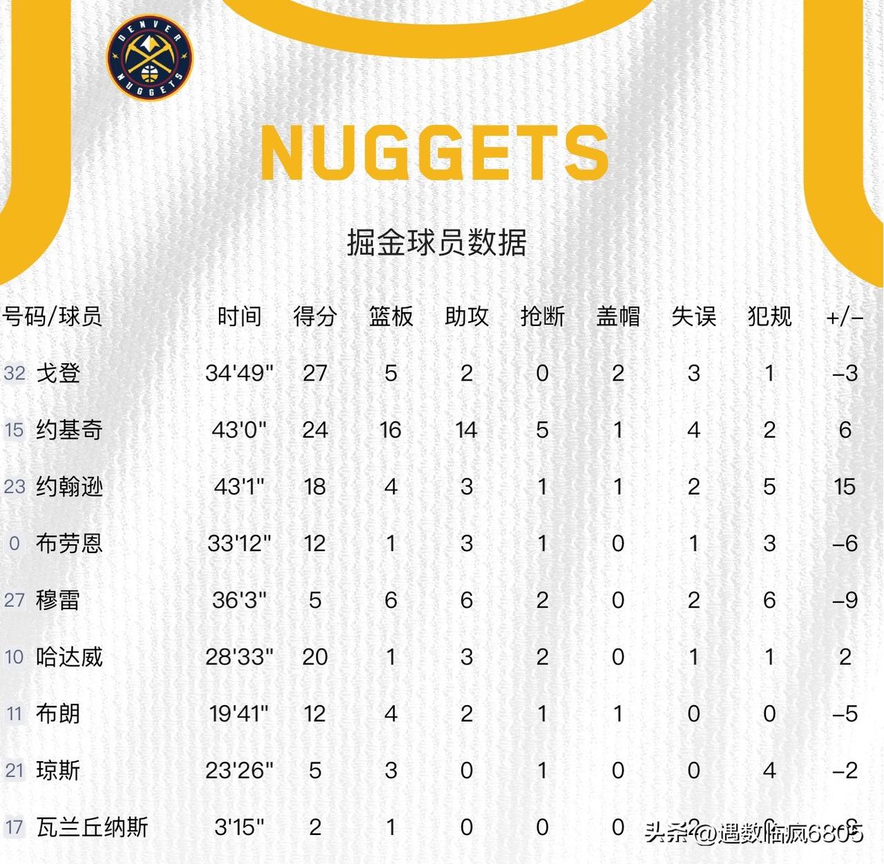 东契奇砍下30 +11 +13,加时准绝杀掘金,湖人超火箭升至西部第三,掘金下滑至第六,与太阳仅有1.5个胜场差,形势不容乐观。 今天湖人坐镇主场迎战上赛季苦主掘金,上半场湖人打得顺风顺水,取得11分的领先优势,第三节掘金逐步缩小差距,湖人的领先优势被一点一点蚕食,双方87平进入末节争夺。最后一节双方针锋相对比分一直胶着,比赛还剩9秒时掘金领先3分,里夫斯被犯规,第一罚命中后第二罚故意罚球不中自己抢到篮板,后仰跳投打进把比赛拖进加时。 加时赛仍然不分伯仲,比赛还剩15秒时双方战成115平,湖人暂停布置最后一攻,东契奇几乎控到最后一秒才出手,稳稳命中,留给掘金仅仅0.6秒,掘金最后一攻远投三分偏出篮框,在客场蚕下一场至关重要的一场失利。湖人获胜后战绩来到42胜2 5负排名反超火箭至第三,而掘金失利后被森林狼挤到第六。 双方数据见图二图三。 本场比赛东契奇和约基奇均砍下三双,东契奇30分11板13助,约基奇24分16板14助。 里夫斯是湖人赢球的大功臣,不但砍下两队最高的32分,还在第四节打进绝平球,正负值为+7,看来下赛季湖人不给里夫斯奉上超级合同是留不住的。 湖人加油!