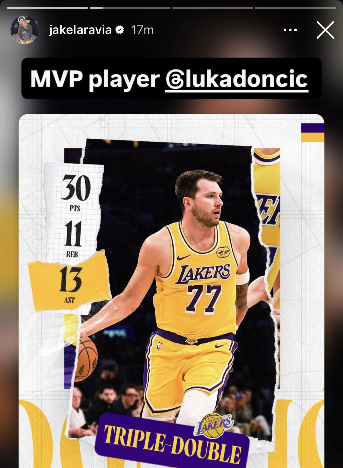 赛后,湖人社媒分享东契奇的个人数据海报,并配文:“三双加上绝杀!卢卡,今晚好好享受吧!”