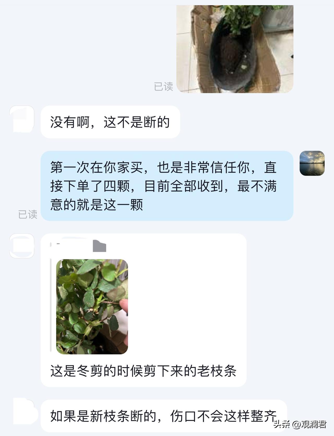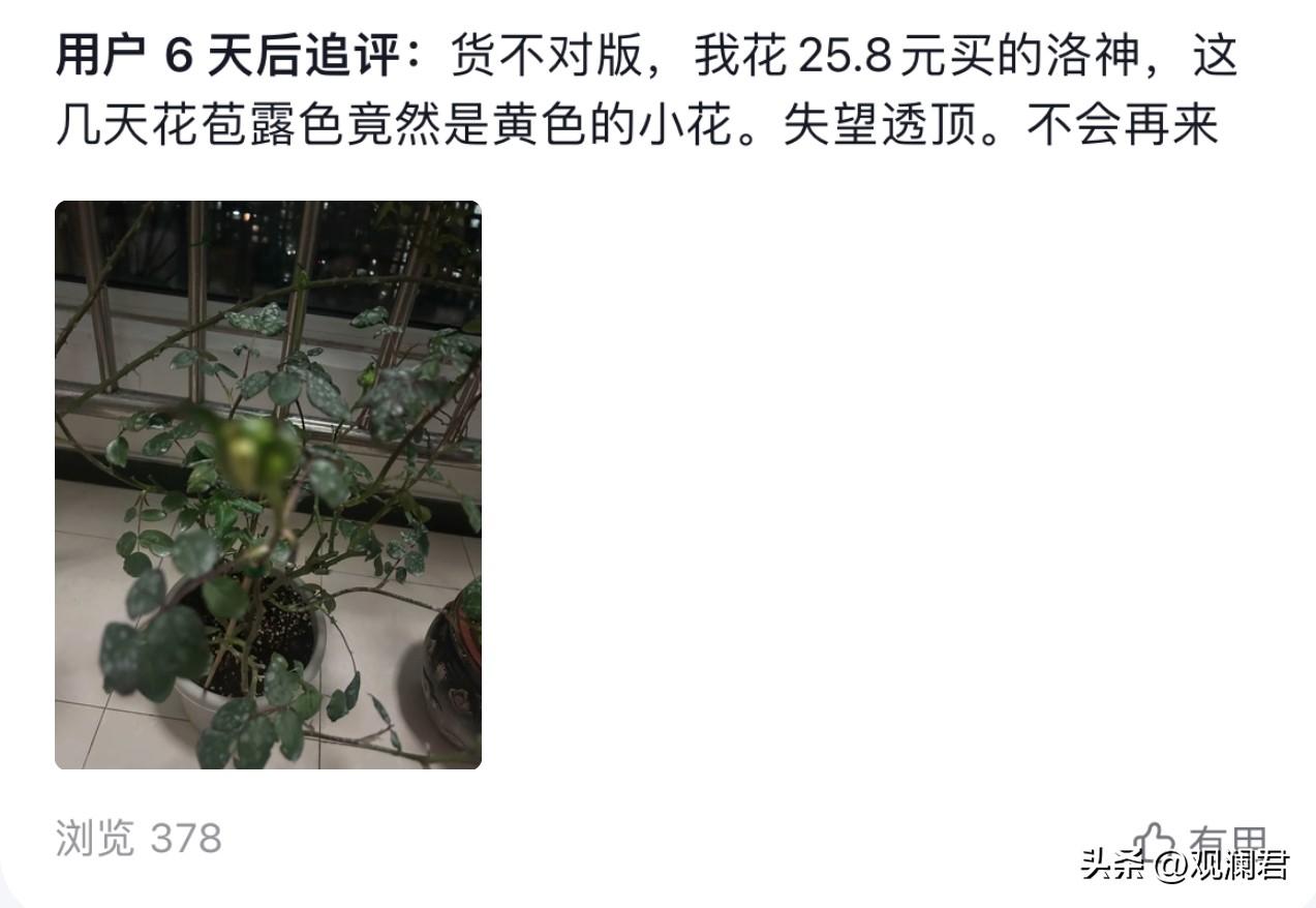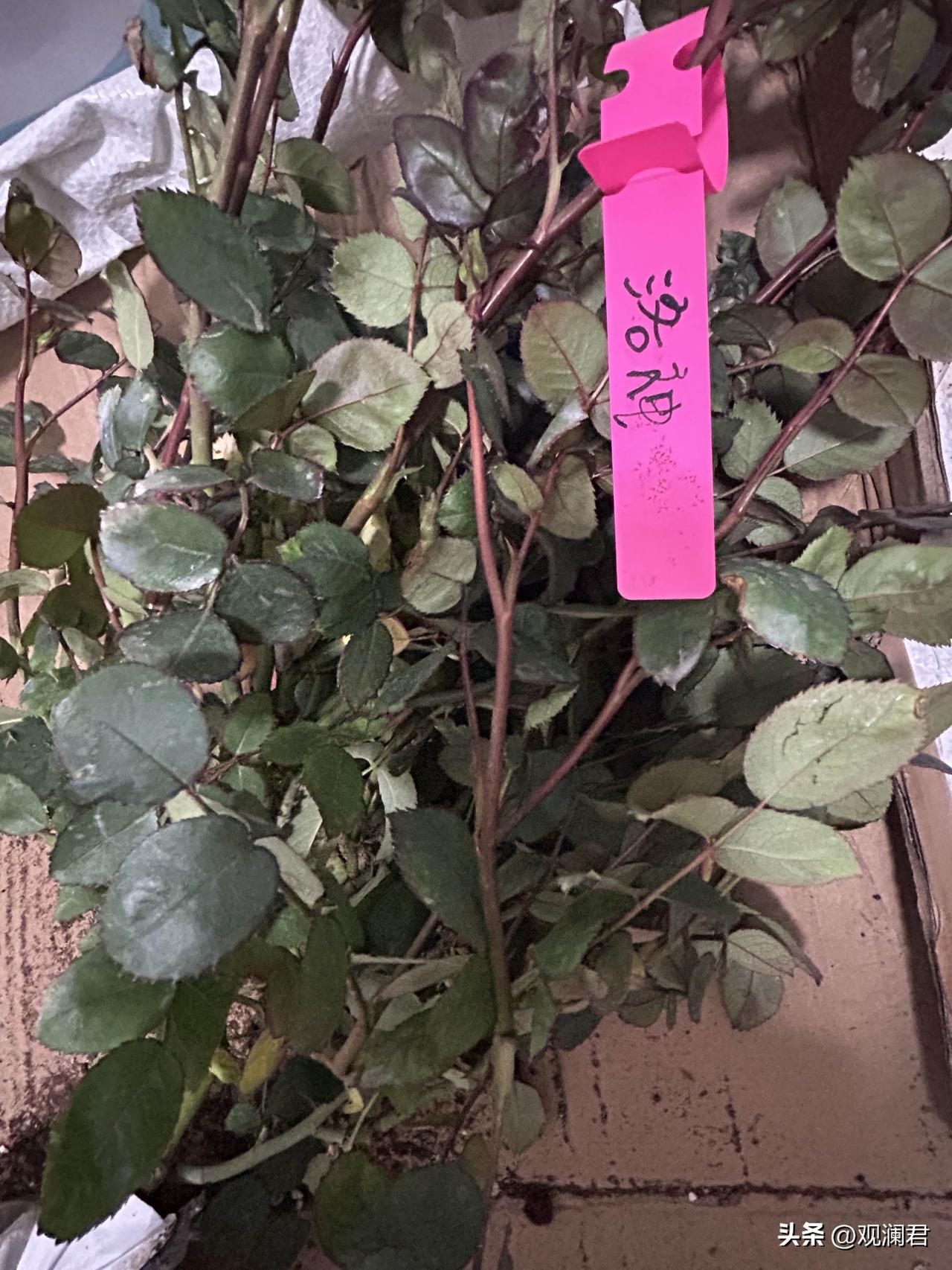 春天来了,又到了买花的季节。洛神月季是我的心头好,我心心念念想要再养一盆。 这几天连续蹲守在各个直播间。 有一天夜里十二点,在一个江苏沭阳夫妻档主播的直播间里,我问有洛神吗,主播豪爽的回答:有!并且说马上要下播了,于是,我赶紧花25.8元买下了一盆“洛神”。不一会,订单状态发生了变化,已发货,有快递单号,是待快递揽收的状态。 三天后,我收到的苗情就是这个状态,把残断的枝条和盲枝剪掉,这颗苗已弱不经风的样子。12天后,这颗苗枝条枝条柔软,有一个花骨朵露色了,我看着它像是白色,又像是黄色,唯独不是粉色,我养过洛神,看着眼前的“洛神”,我知道我踩了坑,叫“货不对版”。