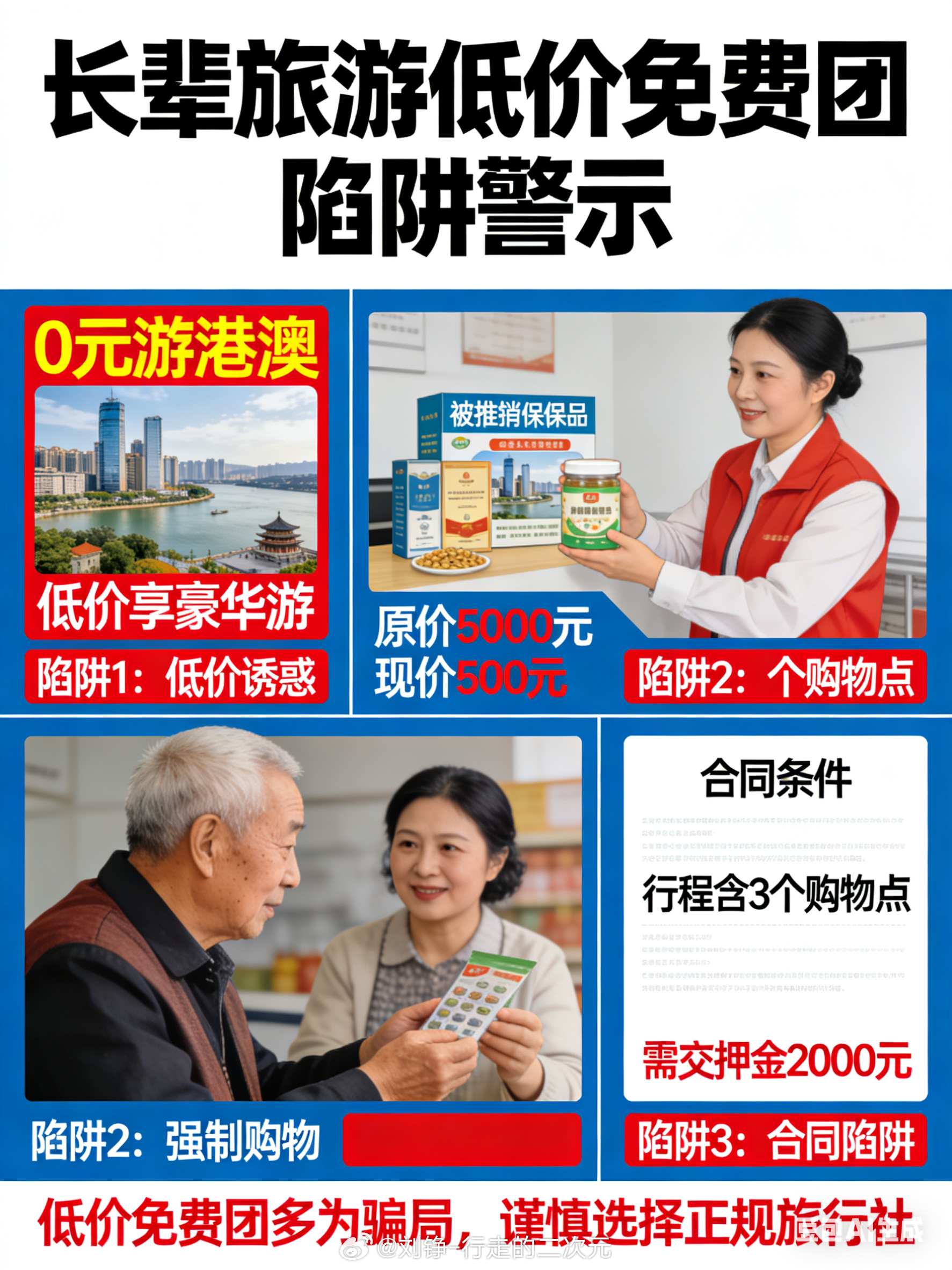 ❌ 低价/免费团=强制购物+保健品陷阱❌ 免费体检、神医问诊=天价三无药❌ 老乡店、民俗馆=高价玉石银器✅ 必做:查资质、签合同、要发票✅ 消费:大额先问子女,不买神药特产✅ 维权:留证据,打12345/12315