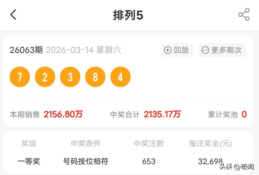 真是活见鬼,排列五一等奖奖金从10万降低到3.2万元。就刚刚才爆出2.97亿的大奖清空奖池后,排列五又闹出笑话,头奖每人只能获得奖金3.2万,中奖者哭笑不得。 3月14日开出的号码72384,居然有653人中奖,而销售金额才2156万,按照规定的每注头奖10万奖金不够分,只能启用特定条款:将全部销售金额除开运作费用后剩余2089万平均分配,每注奖金3.2万元。 网友们意见强烈,有人表示这是不是某人刚刚掏空奖池影响太大,心里有点虚,再制造出大量中奖的现象,试图掩盖单人购买2970注并中一等奖的情况。有人建议成立专案组对这两期的中奖人和情况进行严查,还彩民一个公道。 数字排列5 3月14日排列五今井喷致每注奖金仅3.2万元