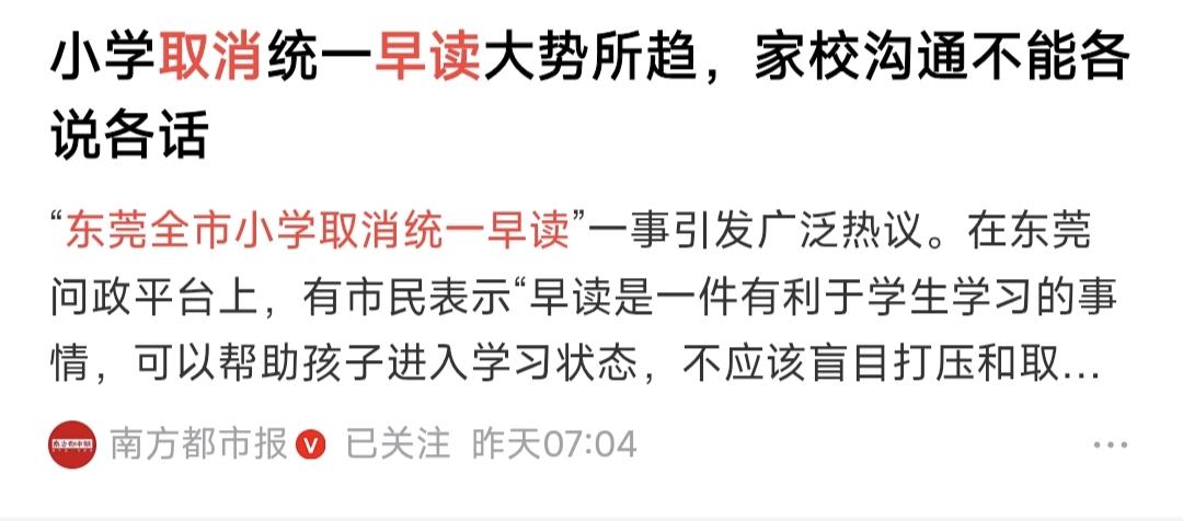 多个地方宣布取消小学统一早读,推迟上学时间,让孩子多睡一会儿,给孩子减负。 我支持给孩子减负,但取消早读,我真的觉得有点可惜。早读不仅仅是让学生读课文,我觉得更重要的是,通过大声朗读把孩子们从昏昏欲睡的梦境中唤醒,调整精神状态,进入正式上课。 我以前在山区支教的时候,其实很喜欢听孩子们早读,就是我们小时候作文经常写的那样,清晨,温暖的阳光洒进教室,同学们坐在教室里面大声朗读课文,朗朗读书声飘荡在学校的上空,让人陶醉。 其实减负可以不取消早读,我个人认为,现在孩子们学的课程太多了,需要压缩教材,精编课程,提升教材的质量,降低作业量。 取消早读,也许我们熟悉的朗朗的读书声会渐行渐远了。当然有人会说,上课的时候也有朗读声,但全校统一早读,我觉得不互相干扰,更好。教育