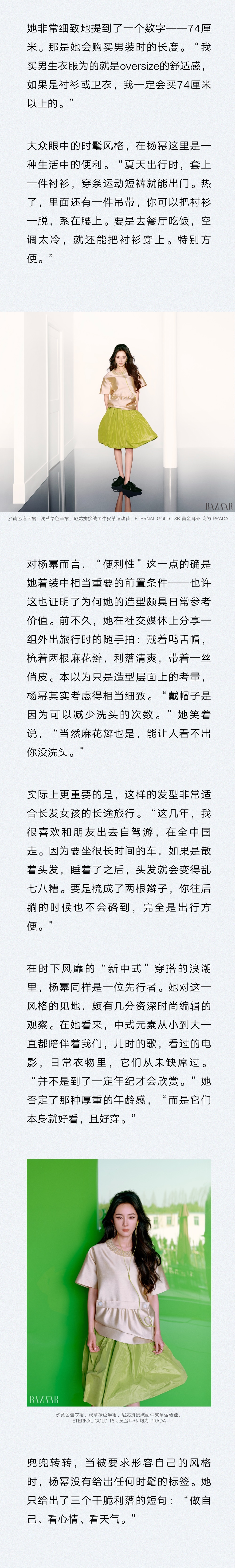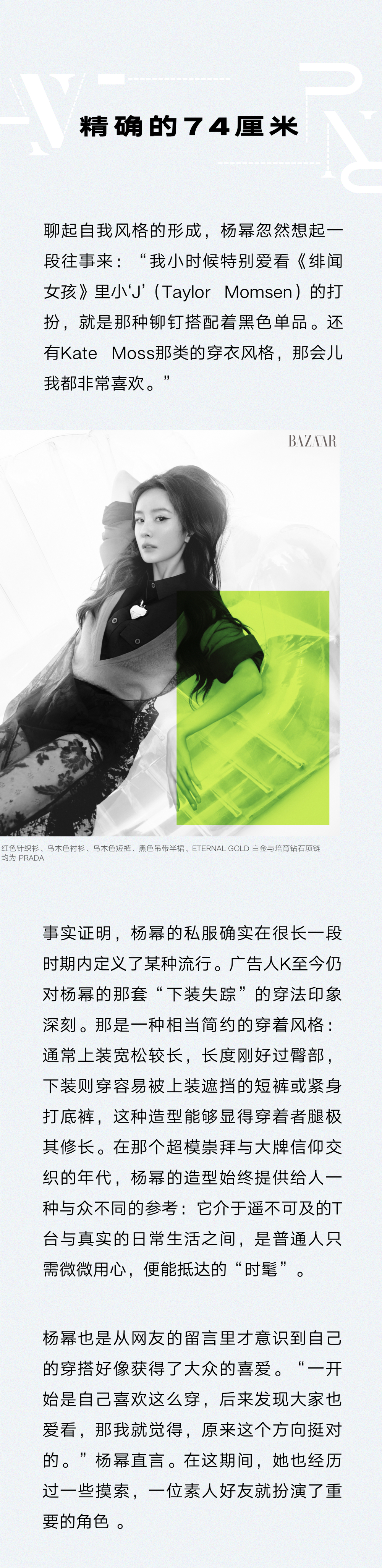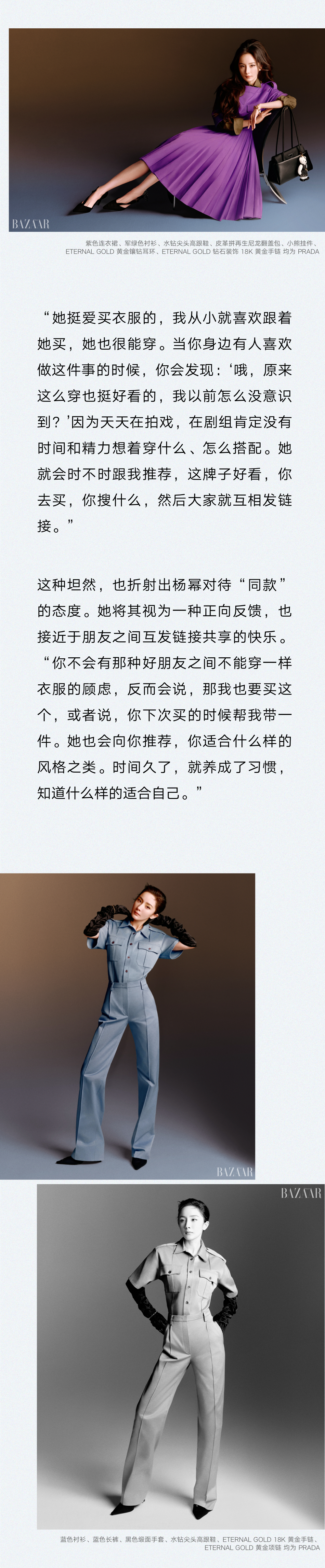 杨幂眼里“公众人物是需要清楚自己职业属性的,因为那意味着你会被很多人看到,很多人会去模仿你,参考你,以及你要清楚自己会因为什么影响到别人。除了外在的东西和影视作品里的表现,更多的还是价值,其中就包括你的选择,你的态度。我觉得,现在大家都挺有个性,很有自己的想法和主。我会鼓励大家不要在意外人的眼光,这也是公众人物的职责。”