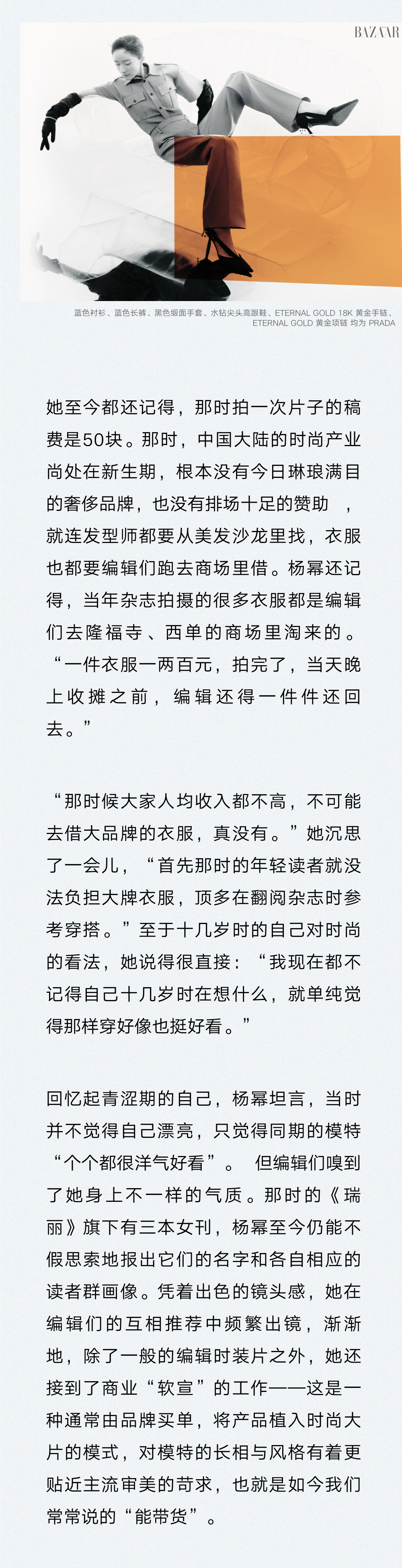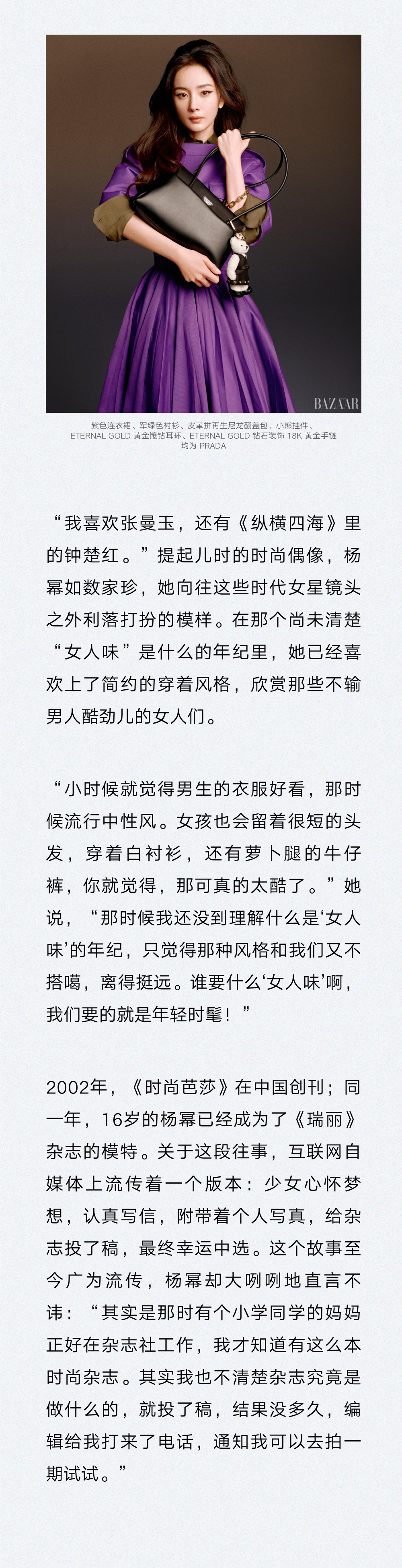 16岁的小幂成为《瑞丽》杂志的模特,第一次拍片子的稿费是50块。先拍了杂志,又拍了广告,自然而然地,就有了剧组面试的机会。幂真正意义上的第一部戏是在16岁的时候,还是小幂自己面试上的那部戏就是电视剧《红粉世家》幂还提到自己带个黑子塑料袋、拉个手推车去西单、北京动物园进货,砍价可行了如何形容自己的穿搭风格时,杨幂说:“做自己,看心情,看天气!”