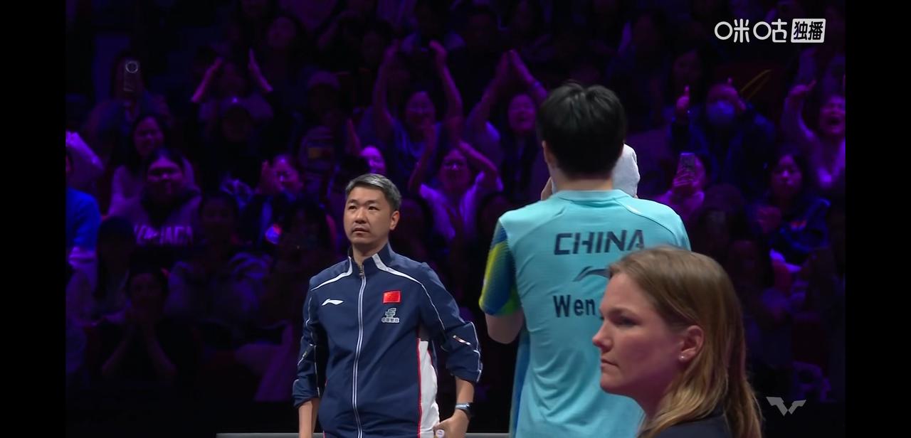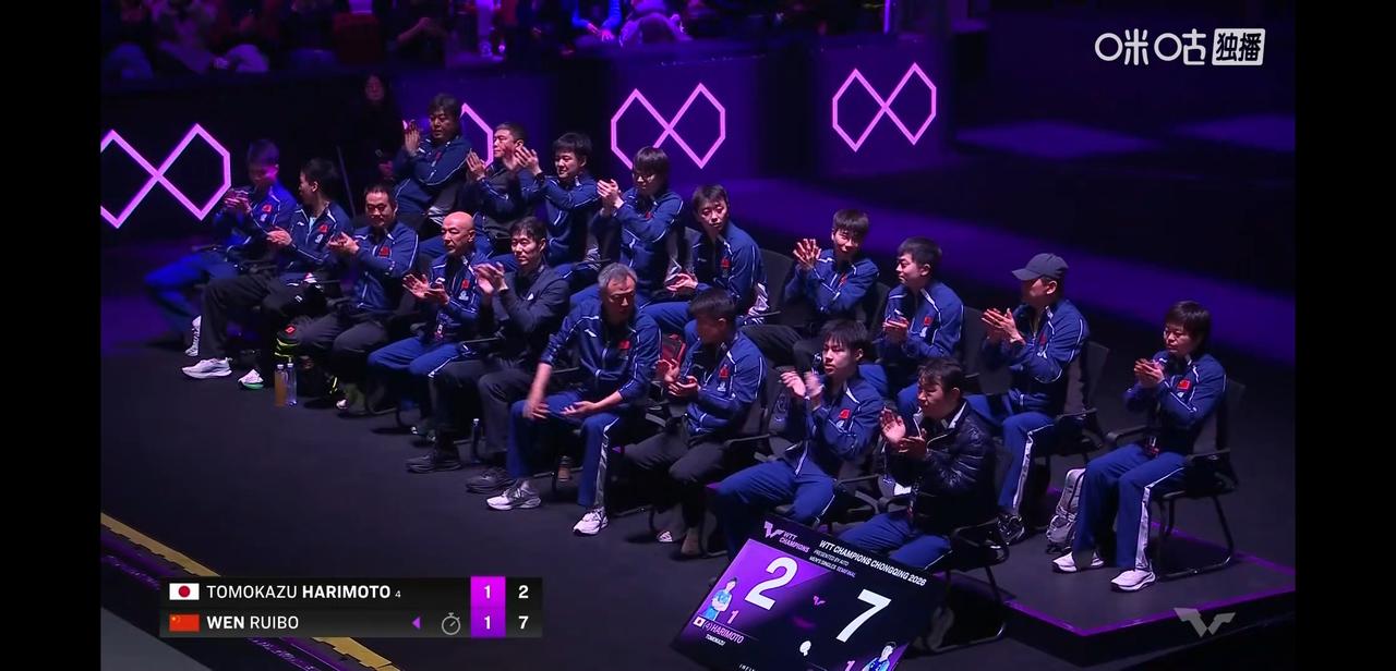 WTT重庆冠军赛赛, 在侯主播的解说下看的热着沸腾。 温瑞博对战张本智和, 目前大比分温瑞博2:1张本智和, 不得不说小温这是我们国乒男单这站的独苗了, 大佬们都来了, 乒协主席王励勤、总教练秦志戬、副总教练肖战、主教练王皓, 秦志戬还不停地与王皓交流。 加油温瑞博。