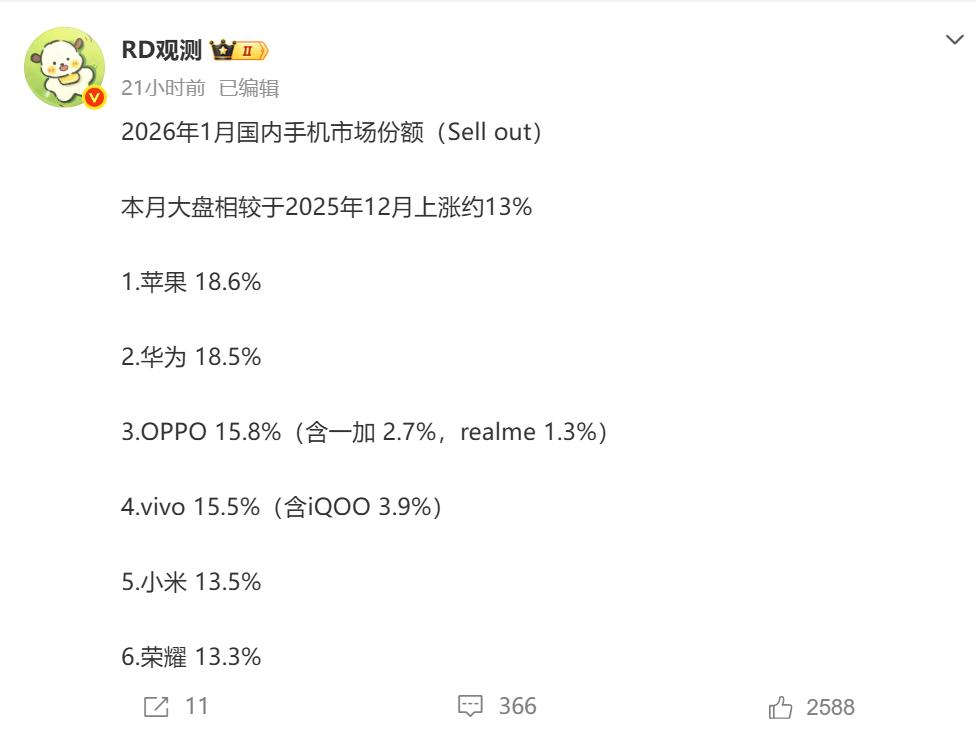小米彻底和荣耀一桌了!华为苹果争第一,OV争第三 2026年1月国内手机市场份额出炉,国内6大主流品牌可以分为3桌,苹果和华为一桌,市场份额18.5%以上,OPPO和vivo一桌,市场份额15.5%以上,小米和荣耀一桌,市场份额13%以上。 苹果华为一桌,争夺国内第一。苹果市场份额18.6%,以微弱的优势领先华为,排名第一,华为以18.5%的市场份额排名第二。 OPPO和vivo一桌,争夺国内第三。真我回归后,OPPO的市场份额有所提升,以15.8%的市场份额排名第三,vivo则以15.5%的市场份额排名第四。 小米彻底和荣耀一桌了,争夺国内前五。小米市场份额13.5%,以微弱的优势领先荣耀,算是保住了国内前5,荣耀则以13.3%的市场份额排名第六。 2026年国内手机市场竞争会更加残酷,全年的格局预估和1月份一致,华为苹果争第一,OV争第三,小米荣耀争第五。