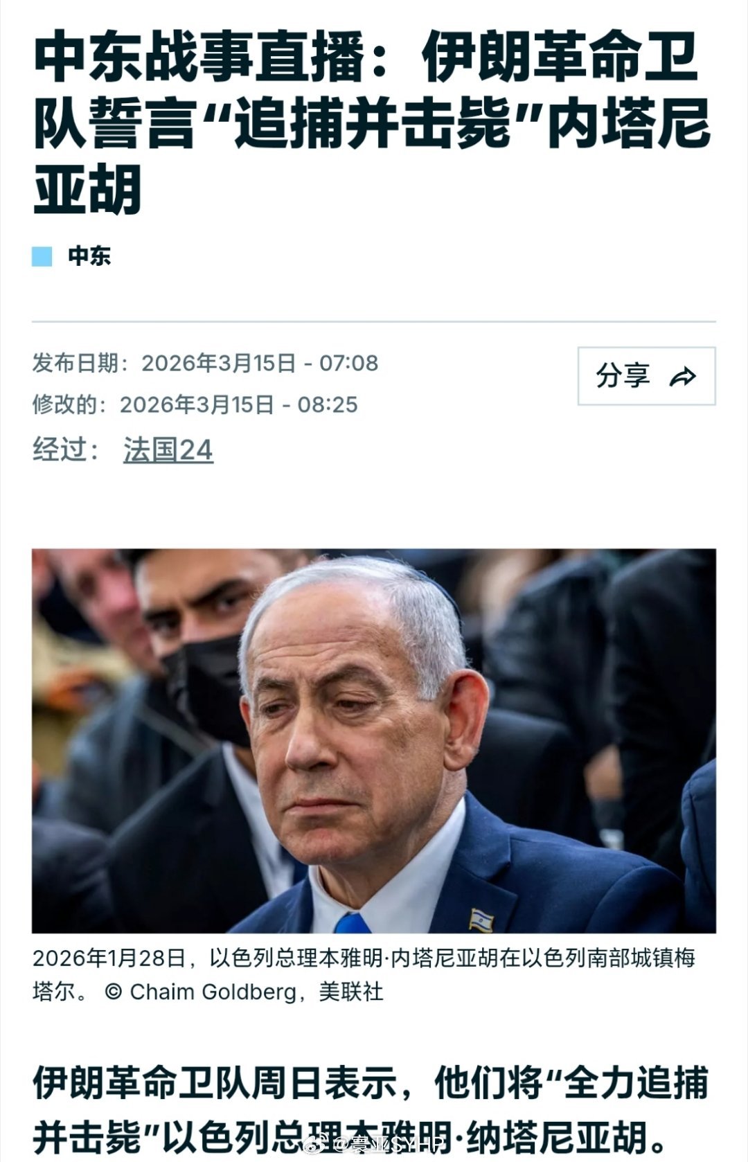 伊朗称将追杀内塔尼亚胡伊朗革命卫队誓言“追捕并击毙”内塔尼亚胡