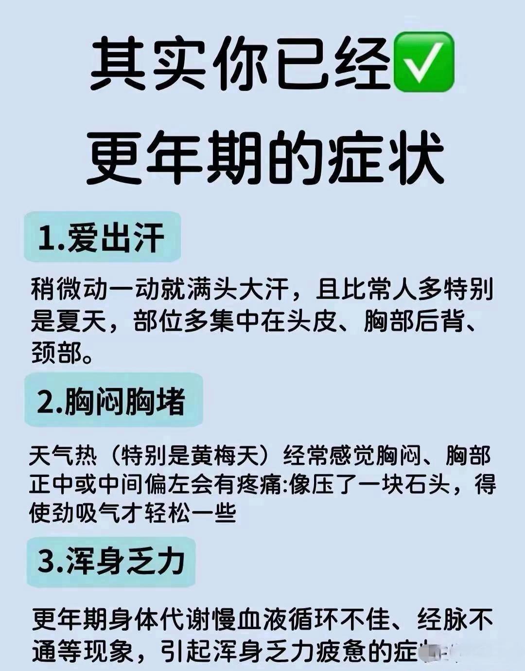 原来很多人早就进入更年期状态了。中了3条以上的姐妹,真的要好好重视起来。少熬夜、少生气、吃对食物、好好爱自己,比什么都重要。