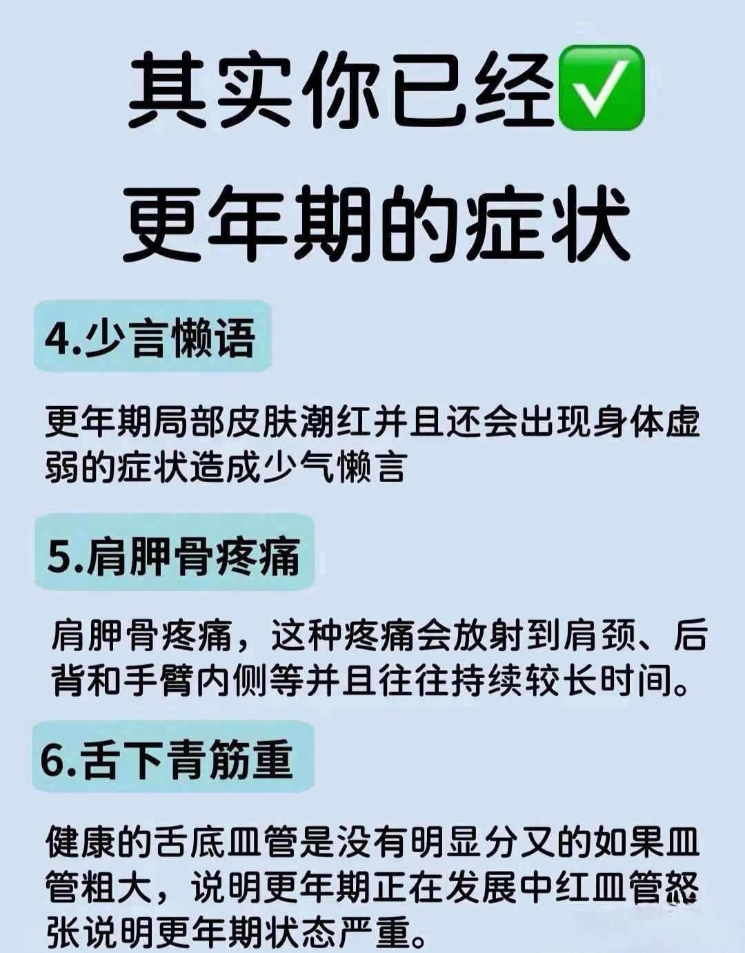 原来很多人早就进入更年期状态了。中了3条以上的姐妹,真的要好好重视起来。少熬夜、
