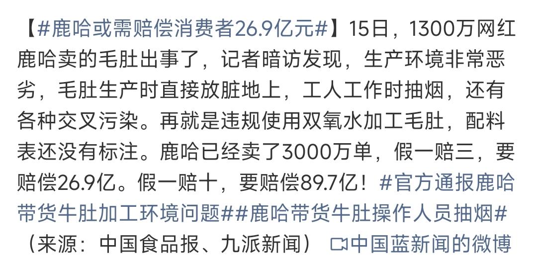 1300万粉丝的大网红,卖的毛肚居然出自脏乱到离谱的黑作坊。 毛肚直接扔脏地上,工人边干活边抽烟,各种交叉污染触目惊心,还敢违规用双氧水加工,配料表连标都不标,完全是把消费者的健康当儿戏。 最让我恶心到反胃的是,之前直播间有人问孕妇能不能吃,他居然脸不红心不跳地说“可以当零食吃”。 我真的想问他,你的良心是被狗吃了吗?孕妇入口的东西有多谨慎不用多说,这种连生产环境都不达标的黑心货,你敢让孕妇当零食吃? 卖了3000万单,算下来假一赔三要赔26.9亿。 我只能说这钱赔得一点不冤。 这种赚黑心钱、毫无底线的网红,就该彻底封杀,永远别再出来坑人。